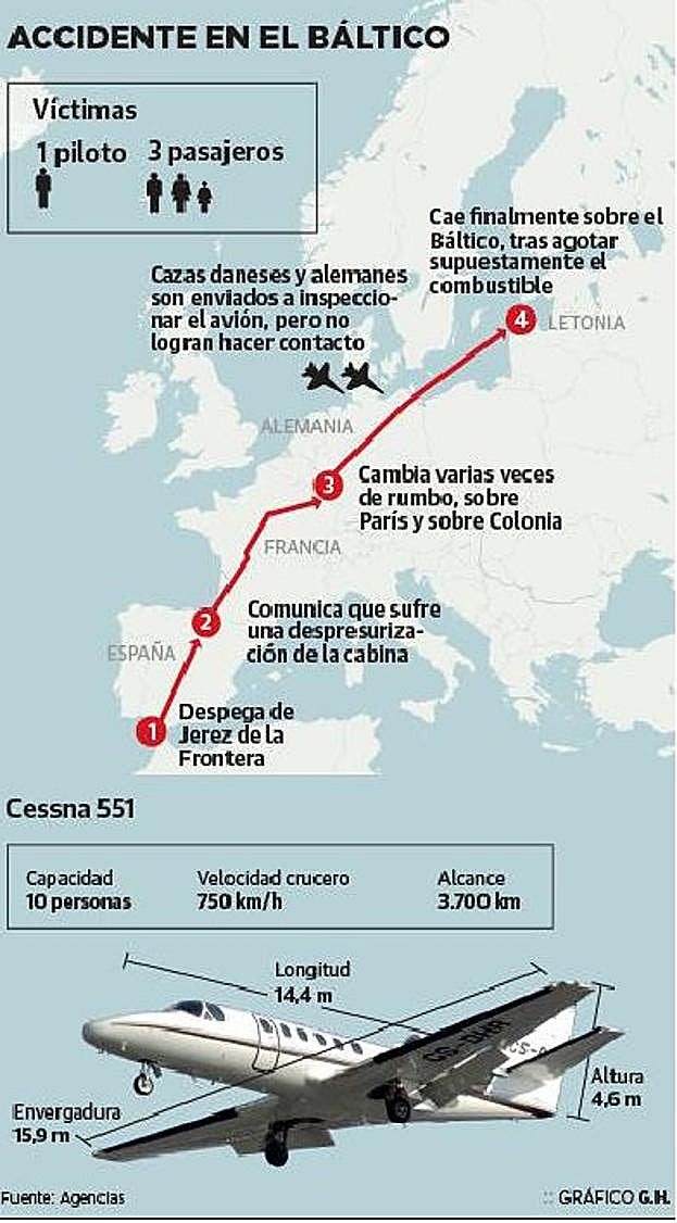 Fuera como fuese, el vuelo OE-FGR continuó su avance. Hizo un giro a la altura de París y otro más adelante, ya dentro del espacio aéreo alemán, en Colonia. Así lo notificó el piloto de un Eurofighter enviado por el Ejército germano que tampoco vio actividad humana en la Cessna. Los últimos testigos del 'vuelo fantasma' fueron dos tripulantes de un caza danés, que tomó el relevo al alemán y pudo seguir su trayectoria final. La avioneta prácticamente planeaba. De repente comenzó a perder altura. Entró en barrena. Había agotado el combustible. Terminó estrellándose violentamente en las aguas del Báltico. Eran las 19.45 horas.