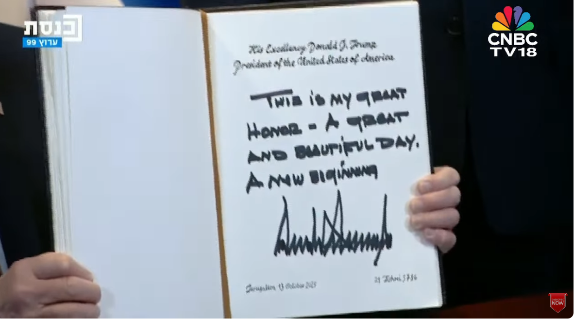 Trump, en el Parlamento israelí para celebrar el acuerdo de paz en Gaza: ¿qué escribió en el libro de honor?