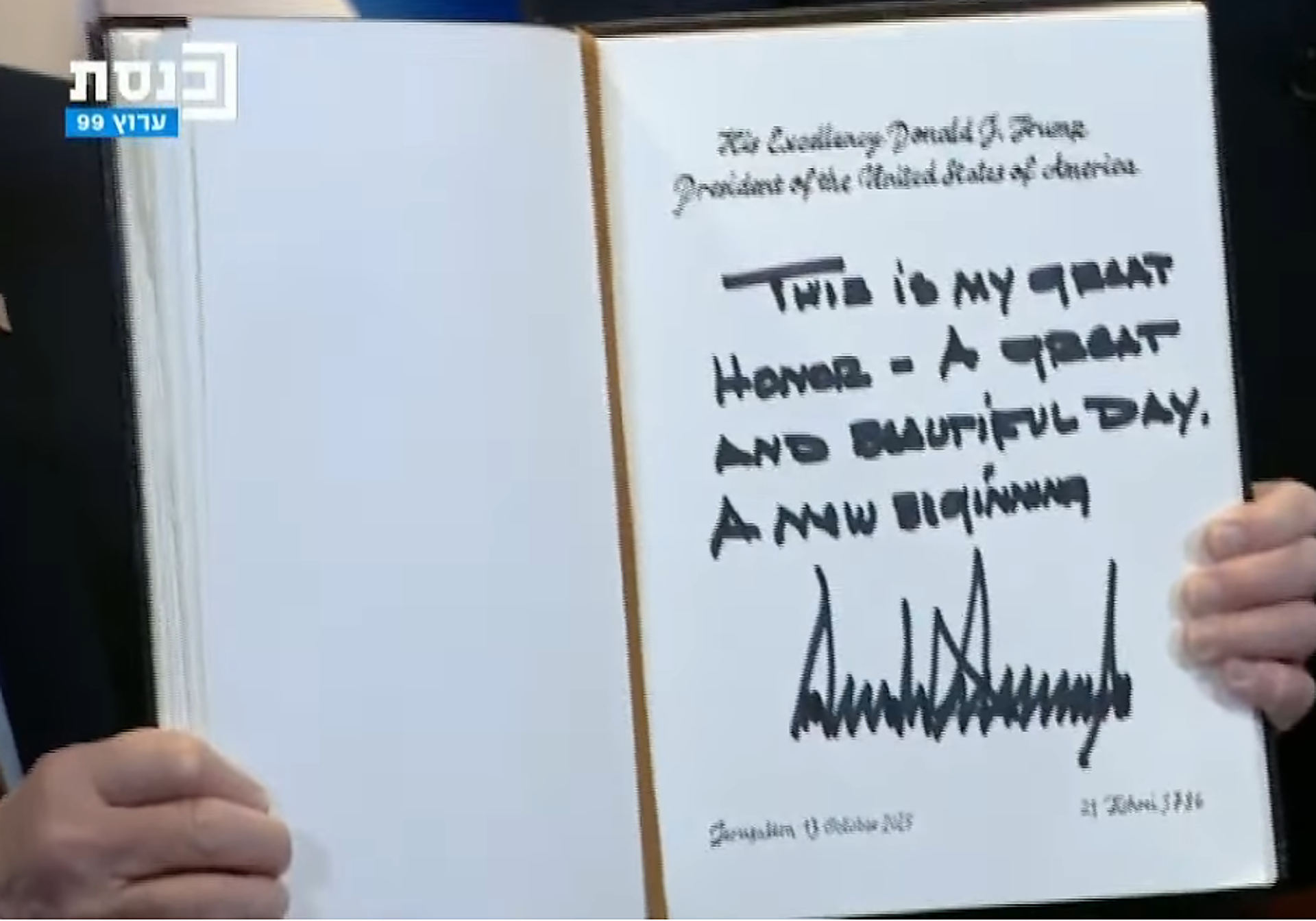 Trump ha conversado a pie de pista con sus enviados especiales, Steve Witkoff y Jared Kusnher, y su hija, Ivanka Trump, que llevan en Jerusalén desde el pasado viernes. En su discurso ante la Cámara, ha anunciado que su propósito es hablar de «paz». El presidente estadounidense ha firmado en el libro de honor: «Es un gran honor para mí. Un buen y bonito día. Un nuevo comienzo», ha escrito con el habitual rotulador de punta gorda con el que da el visto bueno a sus decretos presidenciales. Poco después se ha reunido brevemente con familiares de los rehenes retenidos por Hamás.