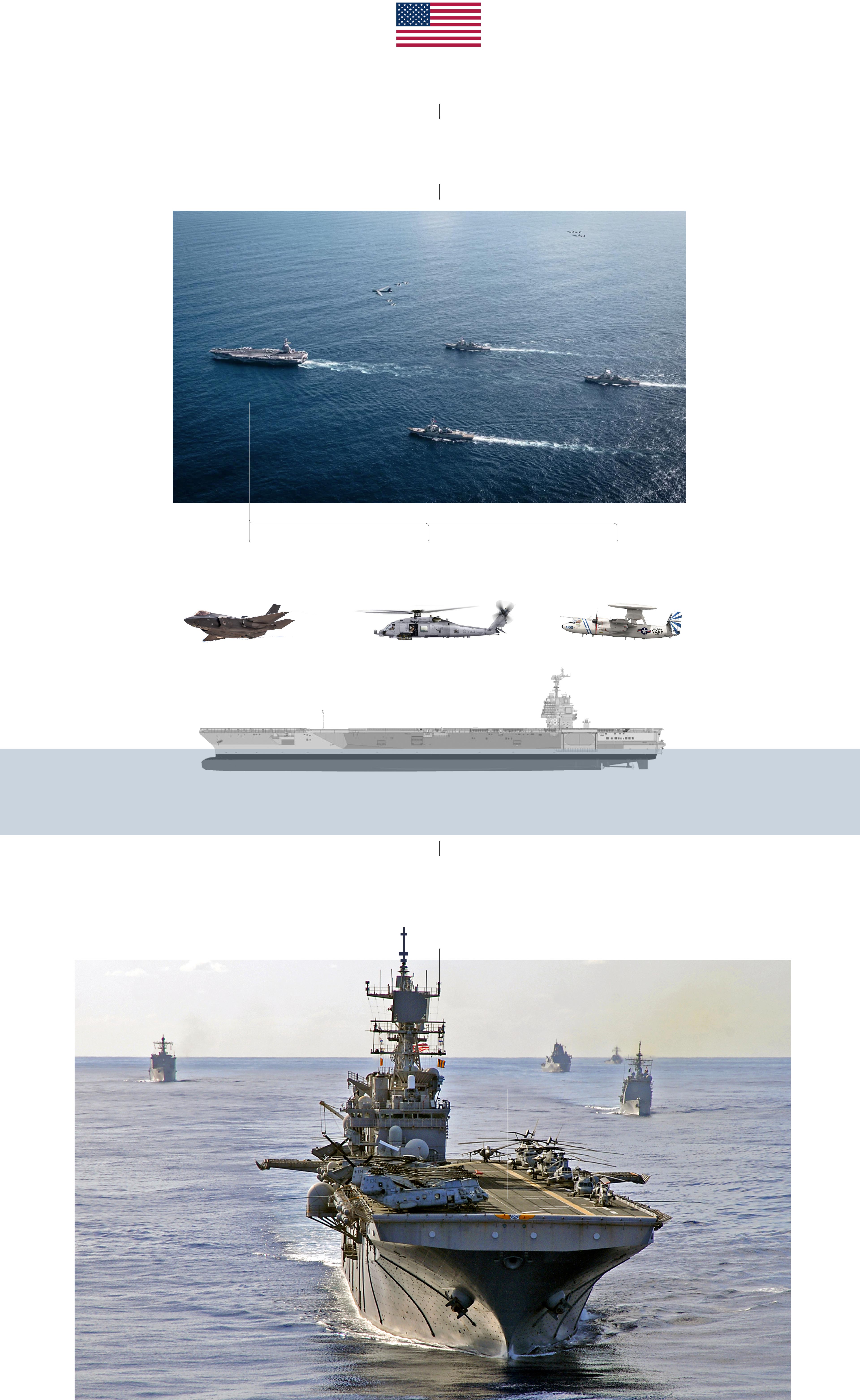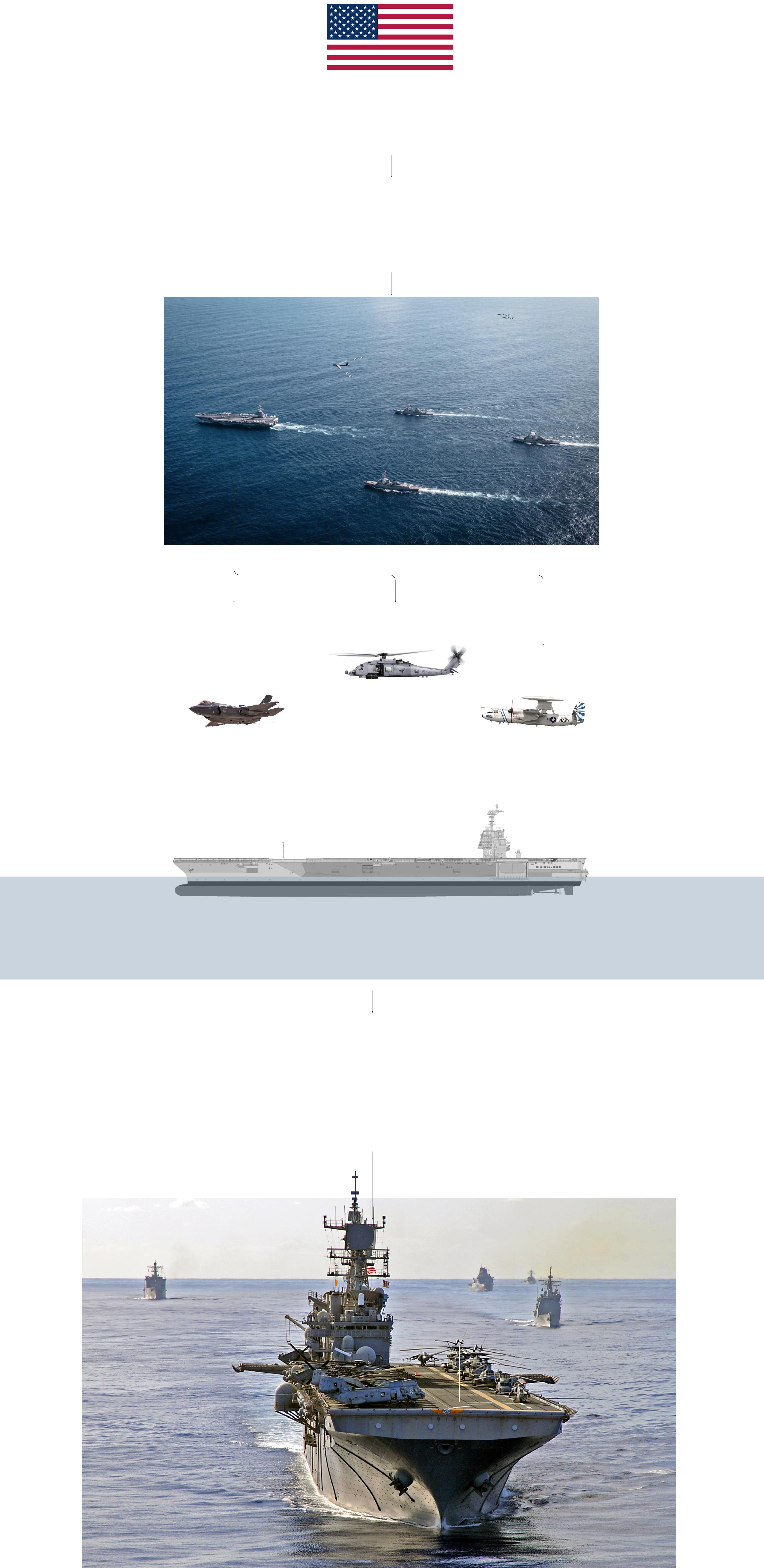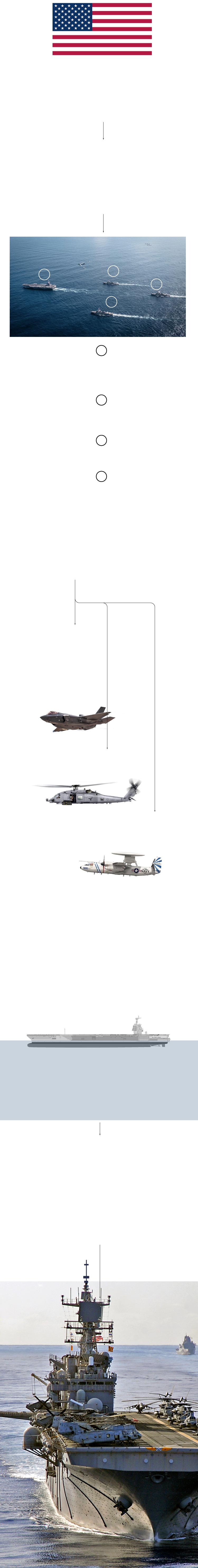 El primero es el portaaviones más grande y moderno de la Marina de Estados Unidos, un gigante de propulsión nuclear con capacidad para un máximo de 75 aeronaves que, ya por sí solas, superarían la capacidad de guerra aérea de Caracas. A bordo viajan los cazas más avanzados de la Fuerza Aérea, los F-35C, una versión específica para operaciones desde el portaaviones. Les acompañan helicópteros Sikorsky MH-60 Seahawk y todos ellos reciben soporte e información de los aviones de alerta temprana Grumman E-2D Hawkeye.