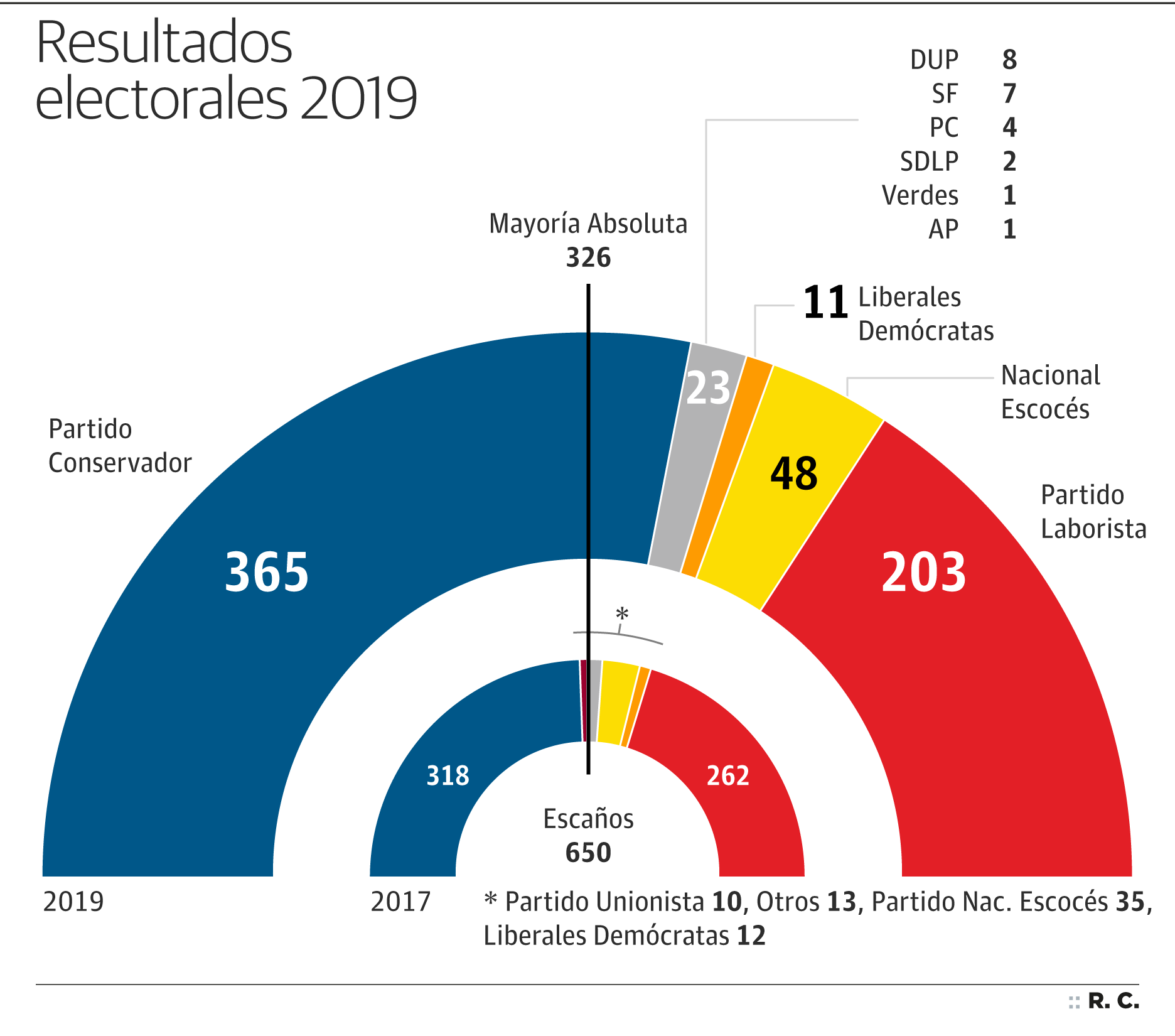 A falta del resultado de una circunscripción muy disputada en Cornualles, porque el mal tiempo ha impedido transportar las urnas desde las islas Scilly, los conservadores de Boris Johnson tienen 364 escaños, los laboristas, 203, el Partido Nacional Escocés, 48, el de los Liberal Demócratas, 11. Será la más amplia mayoría conservadora desde que Margaret Thatcher ganase su tercer mandato en 1987.