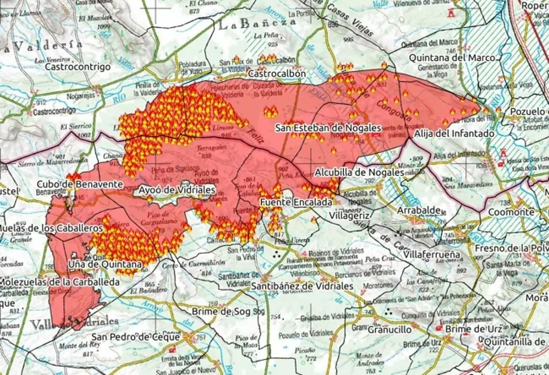 El fuego se originó el pasado domingo en Zamora, concretamente en la localidad de Molezuelas de la Carballeda, pero, el crecimiento progresivo de las llamas, sostenido a su paso por la adversa climatología que imposibilitó cualquier conato de extinción, provocó su salto a la provincia leonesa, donde ya ha asolado algunos de sus pueblos, además de mantener otros amenzados en su quinto día de actividad, informa Leonoticias.