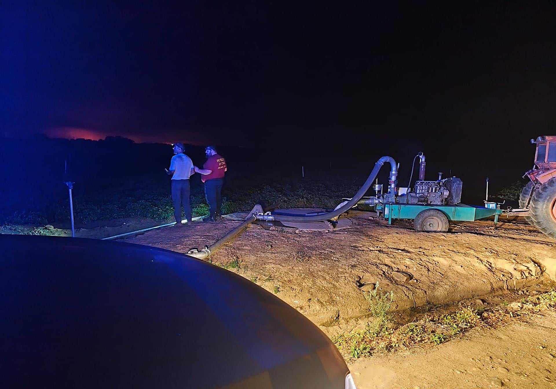 Tras utilizar en primera instancia los vehículos disponibles para elaborar un cortafuegos de unos 300 metros de longitud, después se optó poruna fórmula más novedosa para evitar que el fuego llegara a las viviendas. «Sobre las bombas de regadío montamos una tubería gruesa y cada 18 metros, pusimos una tubería delgada con un pajarito de riego».
