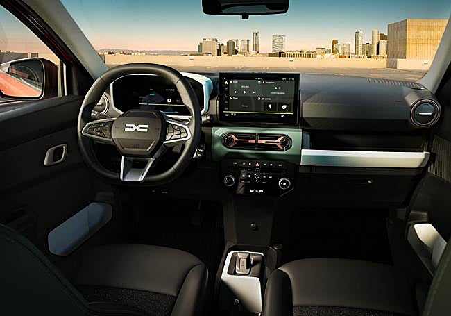 En el interior del Dacia Spring se han rediseñado todos los elementos, así como en el exterior, donde el techo es la única pieza de carrocería que se conserva del modelo anterior. El salpicadero se ha rediseñado por completo, tanto para integrar el nuevo diseño interior de Dacia, que se distingue por una arquitectura mucho más horizontal, como para integrar una nueva gama de pantallas digitales. El Spring recibe un cuadro de instrumentos digital y personalizable con una pantalla de 7 pulgadas en todas las versiones y una gran pantalla multimedia central de 10 pulgadas en el nivel de acabado superior. Situado detrás del nuevo volante, ahora ajustable en altura, estas pantallas a color muestran información esencial de manera simple y efectiva. Se puede personalizar para mostrar datos adicionales como la autonomía restante, el consumo de energía o las ayudas a la conducción.