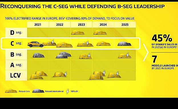 Antes de 2025, lanzará 14 vehículos: 7 serán totalmente eléctricos y los otros 7 formarán parte de los segmentos C/D. Todos los nuevos modelos contarán con una versión eléctrica o híbrida, según ha desvelado en un evento retransmitido de forma telemática. Tras el Mégane eVision eléctrico desvelado en octubre, la marca ha mostrado por primera vez el Renault 5 Prototype, que supondrá el regreso del mítico modelo, ahora con motorización eléctrica -podría producirse en el norte de Francia-, bajo la nueva consigna Nouvelle Vague, un homenaje cinematográfico.