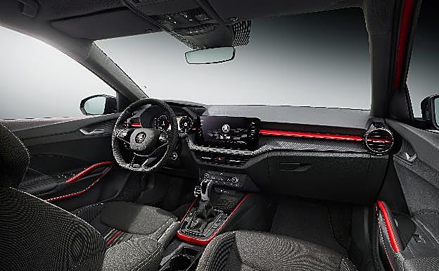 El interior, ahora más amplio, incluye de serie asientos deportivos con reposacabezas integrados y un volante multifunción de tres radios. Además, es predominantemente negro, aunque la franja decorativa del salpicadero, algunas partes de la consola central y los tiradores de las puertas aportan un toque de color rojo. Los reposabrazos en las puertas delanteras y en la parte inferior del salpicadero tienen un aspecto de fibra de carbono. Este modelo también se puede equipar con todos los elementos de seguridad, asistencia y confort, así como con los sistemas de infoentretenimiento disponibles para la gama. El cuadro de instrumentos digital de serie proporciona un fondo de pantalla específico y más dinámico para las disposiciones.