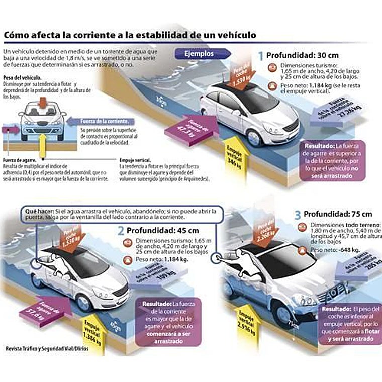 Según señalan expertos en la revista «Tráfico» de la DGT, la creencia de que un vehículo es seguro frente a la fuerza del agua es una falsa sensación. Con una profundidad de 30-45 centímetros, un coche puede empezar a descontrolarse y, si el calado alcanza los 60 centímetros, el vehículo, independientemente de su tamaño, puede ser arrastrado por la corriente.
