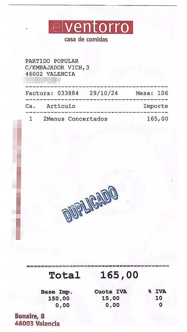 Del techo, sobre la mesa, cuela una lampara colgante, sin un sólo cuadro que decore las paredes, como se aprecia en las fotos. No es el único documento aportado a la jueza por el restaurador. Como también le solicitó la magistrada, el dueño del céntrico restaurante aporta la factura que emitió el establecimiento tras la comida entre Mazón y Vilaplana. En ella se puede leer «dos menus concertados», por un precio total, con el IVA incluido, de 165 euros. Tal y como declaró en su comparecencia el testigo, el cargo fue remitido al Partido Popular. El PP figura como destinatario de la factura.