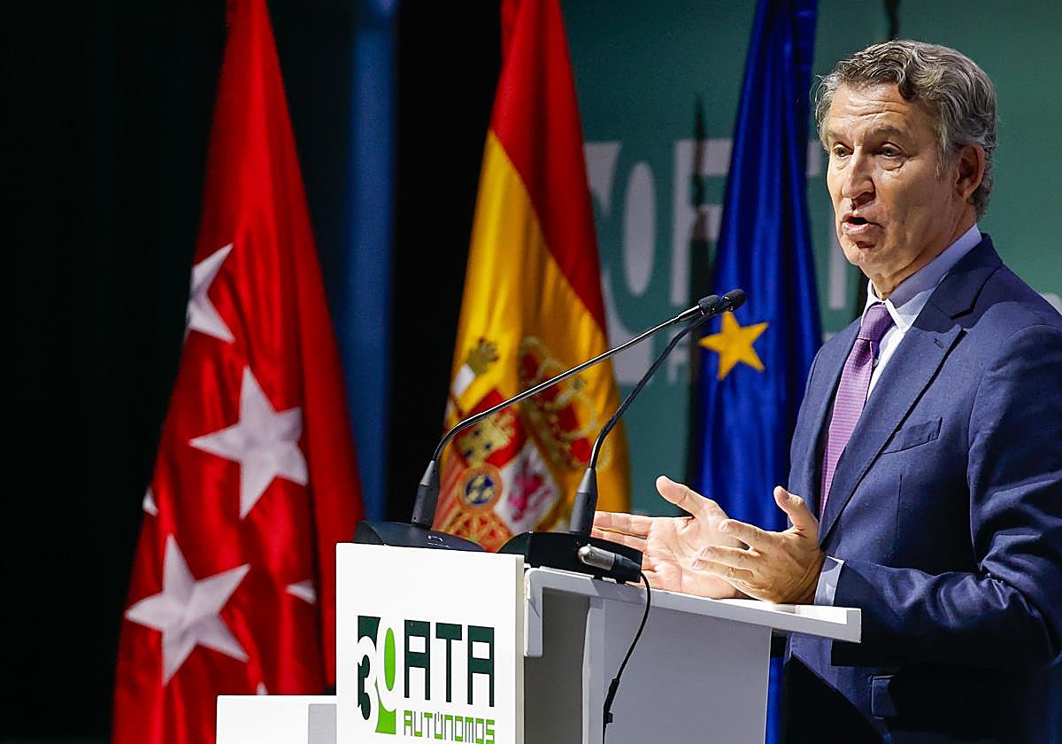 Alberto Núñez Feijóo esbozó este lunes las líneas generales del plan integral para autónomos en el que el PP lleva semanas trabajando para «aliviar y ... no asfixiar» a los tres millones de trabajadores por cuenta propia que hay en España. Diez medidas en total, algunas ya presentadas durante la campaña de las municipales y generales de 2023 o que ha ido desgranando estos días, que el líder de los populares se compromete a poner en marcha si llega la Moncloa y que se centran principalmente a alivios fiscales, reducción «drástica» de la burocracia o la flexibilización del pago de las cuotas a la Seguridad Social. El objetivo, explicó, es «aliviar, no asfixiar» a quienes sostienen buena parte de la economía española. «Lo último que les faltaba a los autónomos es utilizarlos como rehenes de un Gobierno que no les para de subir impuestos», criticó en la celebración de los Premios Autónomo del Año de ATA.