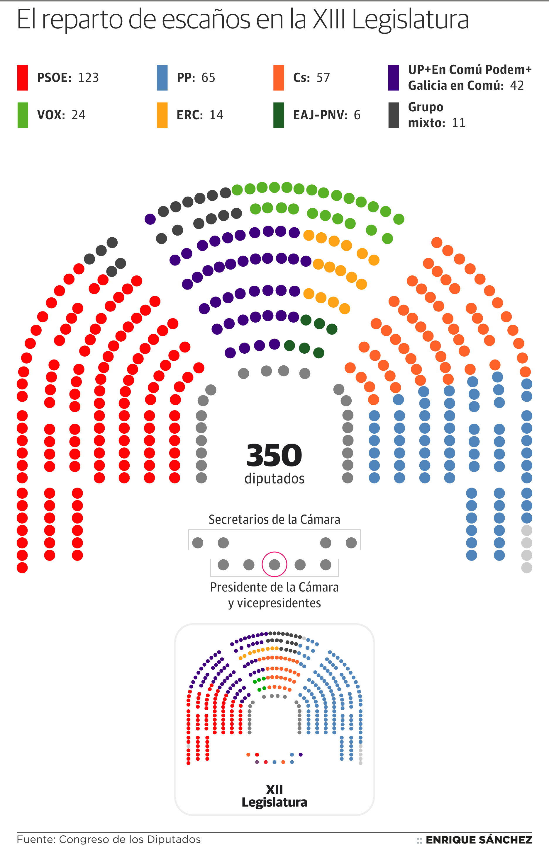 En el boceto diseñado por el PSOE y Unidas Podemos, los socialistas se han reservado el ala izquierda del hemiciclo, su lugar habitual, desplazando a la formación morada a la bancada central y con cuatro asientos en primera fila para Pablo Iglesias y tres colaboradores. A su lado, los nacionalistas vascos, que tendrán seis asientos privilegiados, tres en la fila detrás del Gobierno. Una ubicación «de honor», en opinión de la nueva portavoz de Ciudadanos, Inés Arrimadas, como un «premio por su lealtad» para darles «en los despachos lo que no se ha ganado en las urnas».