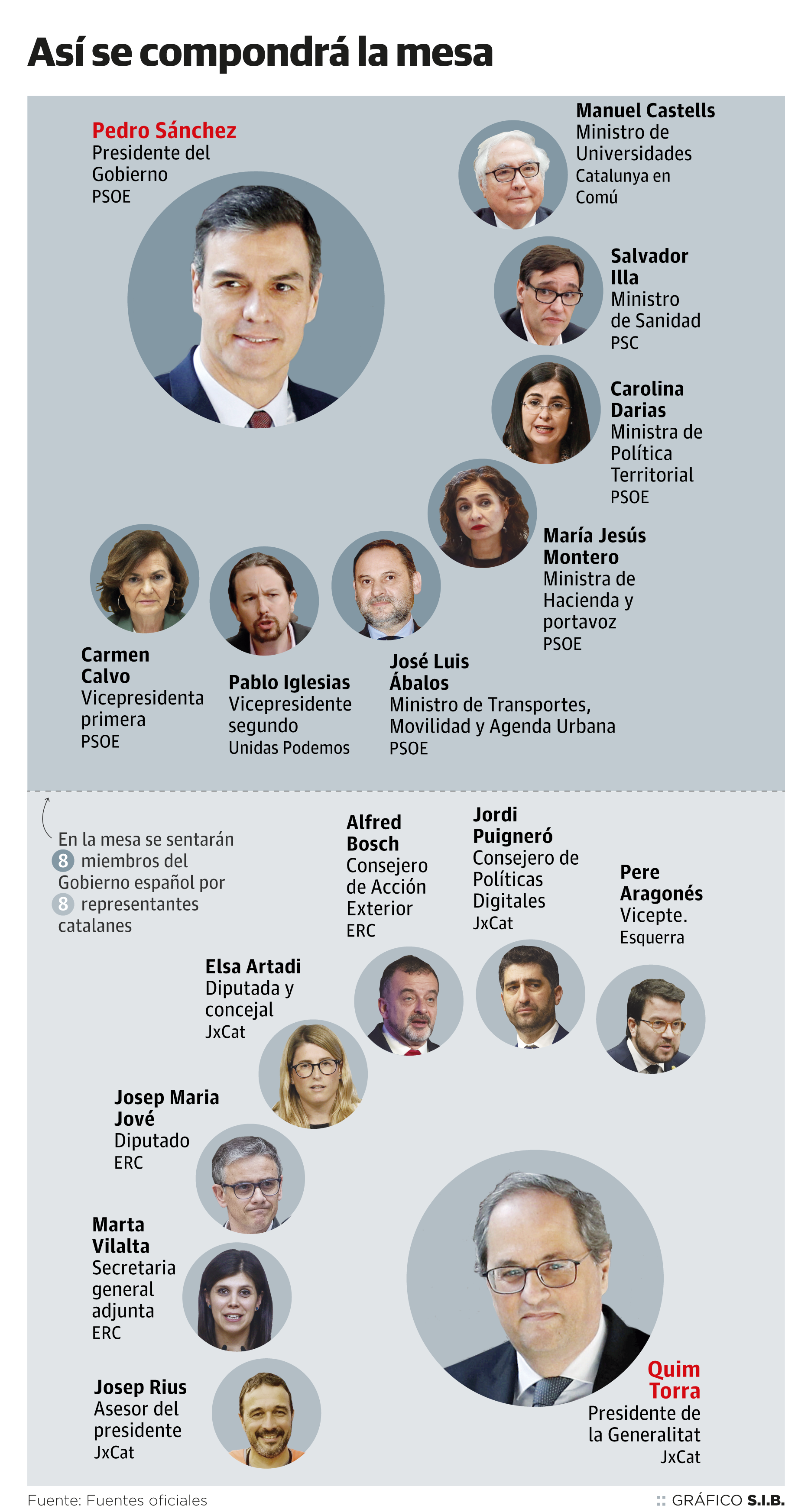 Así, acudirán el president Quim Torra y el vicepresidente Pere Aragonés y los consejeros Jordi Puigneró (JxCat) y Alfred Bosch (ERC), así como las diputadas Elsa Artadi (JxCat) y Marta Vilalta (ERC), el republicano Josep Maria Jové (ideólogo del 1-O que ERC incluyó en su equipo negociador con el PSOE) y el ex jefe de gabinete de los presidentes Puigdemont y Torra, Josep Rius, actualmente con un cargo de director general en la Generalitat. Son ocho delegados, cuatro por partido. Torra y Aragonés sólo acudirán a las reuniones de apertura y a aquellas donde se vaya a sellar acuerdos. «Los otros seis representantes asistirán a todas las reuniones y serán la delegación permanente», señalaron desde el Govern.