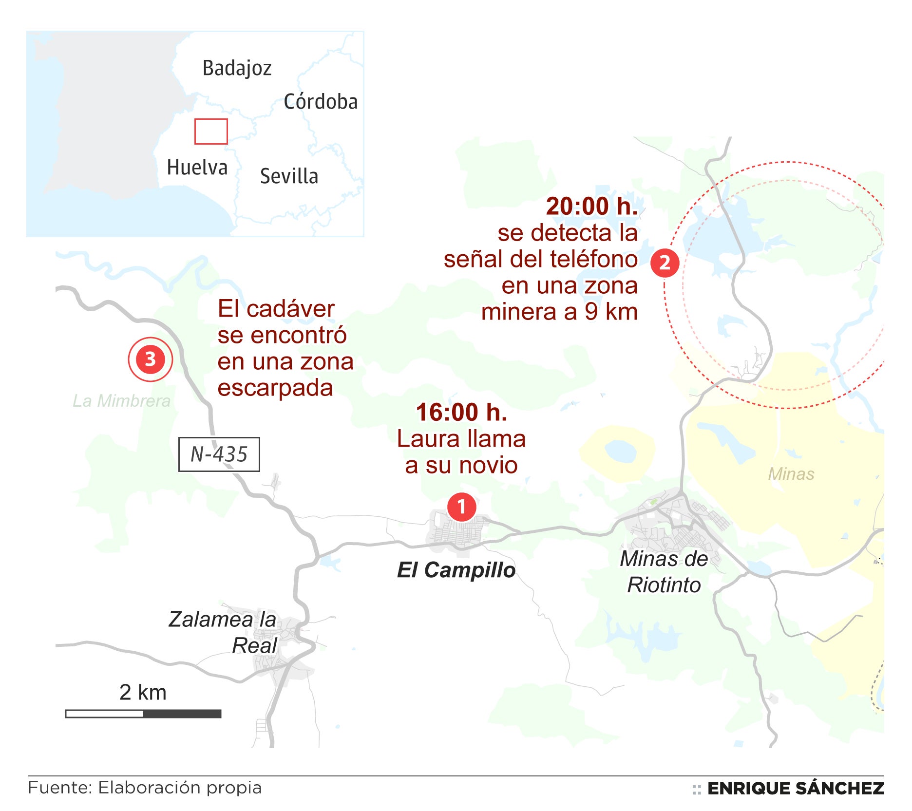 El hecho de que la última señal del móvil de la chica fuera captada a las 20 horas del miércoles de la pasada semana por una antena a 9 kilómetros al norte de El Campillo, muy alejada de La Mimbrera, abona la tesis de que Laura Luelmo fue asesinada en otro lugar y luego llevada en un vehículo hasta el barranco.
