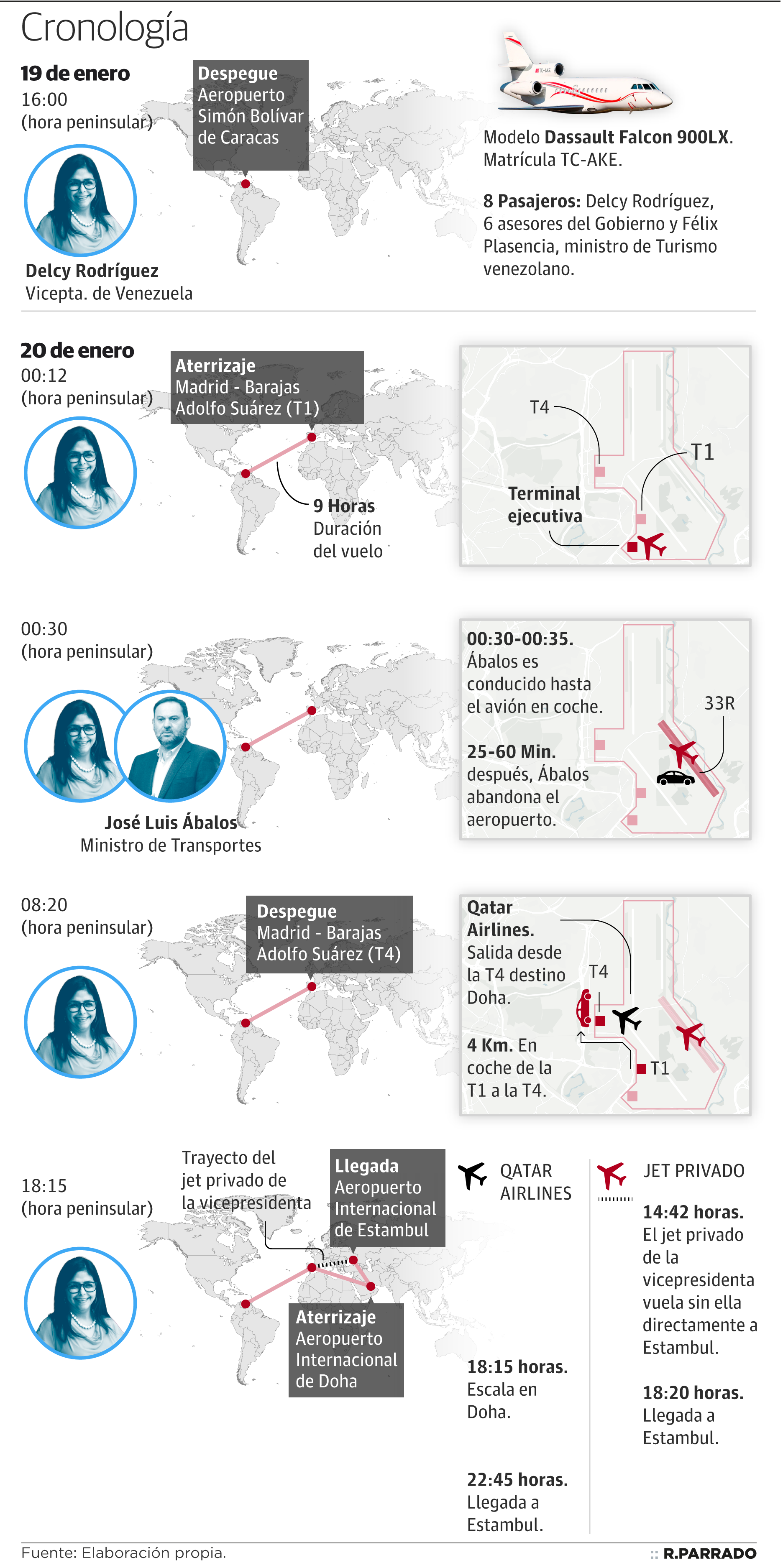El viaje de Rodríguez, que no la escala en Madrid, no era ningún secreto. El 22 de enero se iba a reunir con su homólogo Fuat Oktay en Turquía, como así finalmente ocurrió. La vicepresidenta venezolana partió el domingo 19 de enero sobre las 11 horas (16 horas peninsular española) del aeropuerto Simón Bolívar de Caracas a bordo de un Dassault Falcon 900LX, matrícula TC-AKE, operado por la compañía Sky Valet, con tripulación turca y base en el aeropuerto de Ataturk en Estambul.