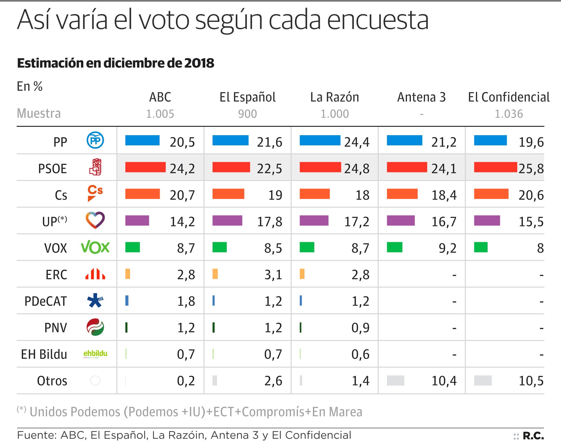 Otro dato que recogen las cinco encuestas es la entrada de Vox en el Congreso. El estudio de ABC le asigna el mejor resultado con 19 diputados, mientras que el de La Razón es el que marca peores expectativas, de 11 a 14.