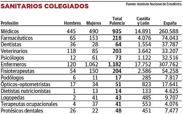 España cuenta cada vez con más sanitarios, según las cifras que arroja el Instituto Nacional de Estadística del año 2018. El número de profesionales sanitarios ... colegiados (852.481) aumentó un 3,7% respecto al año anterior, con enfermeros, médicos y farmacéuticos, respectivamente, como las tres titulaciones profesionales con más colegiación. La provincia de Palencia se mantiene en la tónica del conjunto de España, también con 1.182 enfermeros, 935 médicos y 218 farmacéuticos, respectivamente.