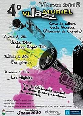El Festival de Jazz de Villamuriel de Cerrato arranca este 2018 con su cuarta edición, organizado por el Ayuntamiento de Villamuriel y la Asociación Cultural Jazzeando, en el cual, colabora la Diputación de Palencia y el Estudio Eldana de Dueñas. La cita será los próximos días 2, 3 y 4 de marzo y acercará a la Casa de Cultura Jesús Meneses a reconocidos músicos de ámbito local y nacional.