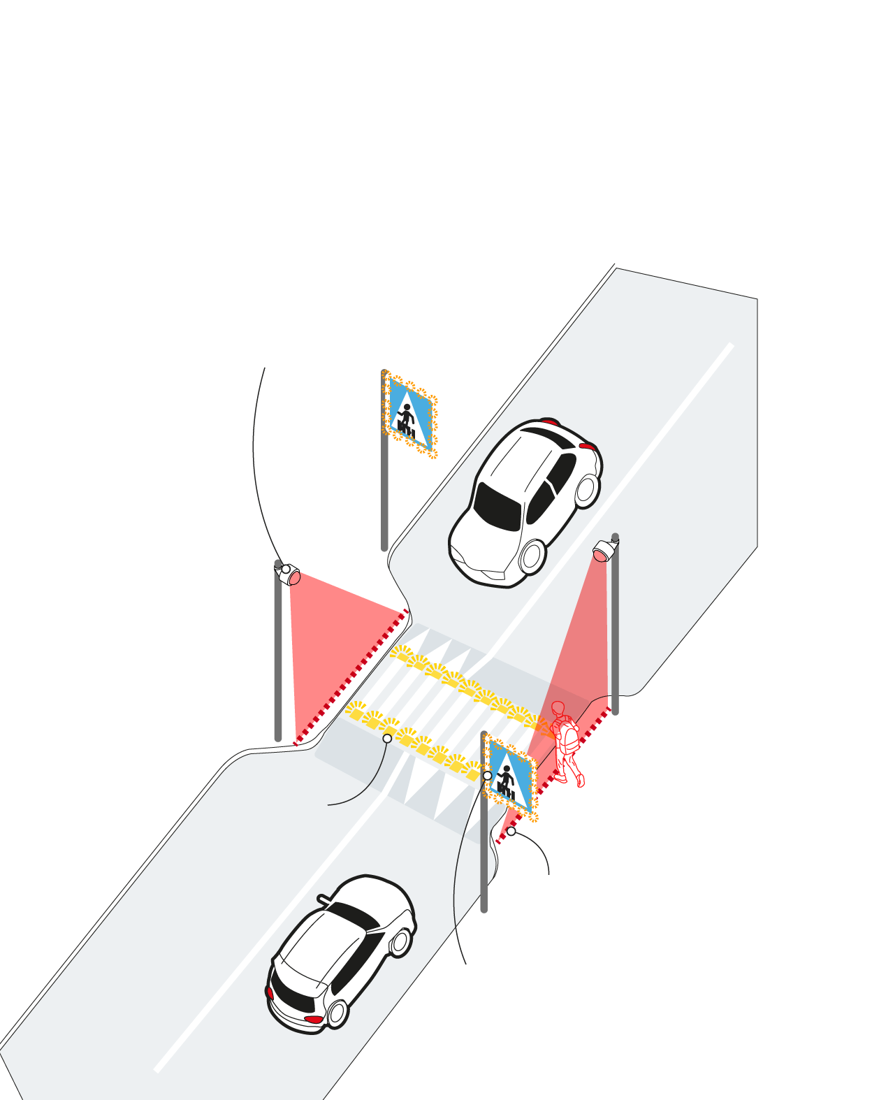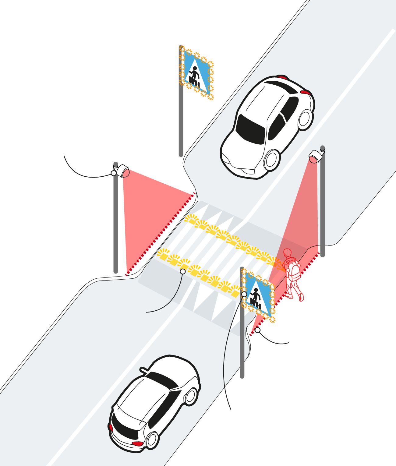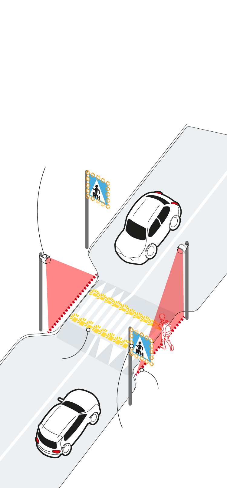 Cuando los sensores detectan que un peatón traspasa la zona de detección, las señales luminosas colocadas en la calzada y las verticales, se activan.