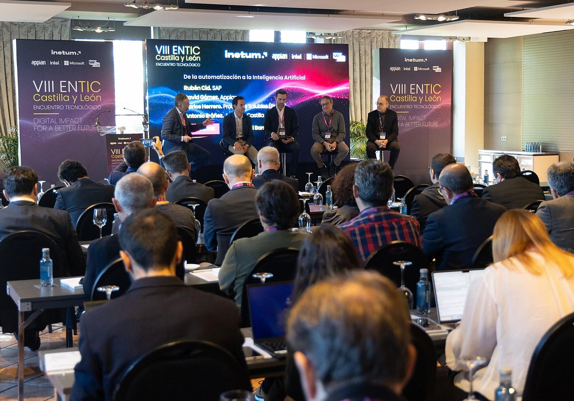 La primera mesa redonda, titulada 'De la automatización a la inteligencia artificial' fue moderada por Miguel Ángel Barrio, director Digitals de Inetum, y en la que participaron Antonio Ibáñez, director general de Telecomunicaciones y Administración Digital de la Junta de Castilla y León; Rubén Cid, Solution Advisor Innovation de SAP; David Gómez, Broad Markets Account Executive de Appian y, por último, Carlos Herrero, director de Transformación Digital de Productos Solubles (Prosol).