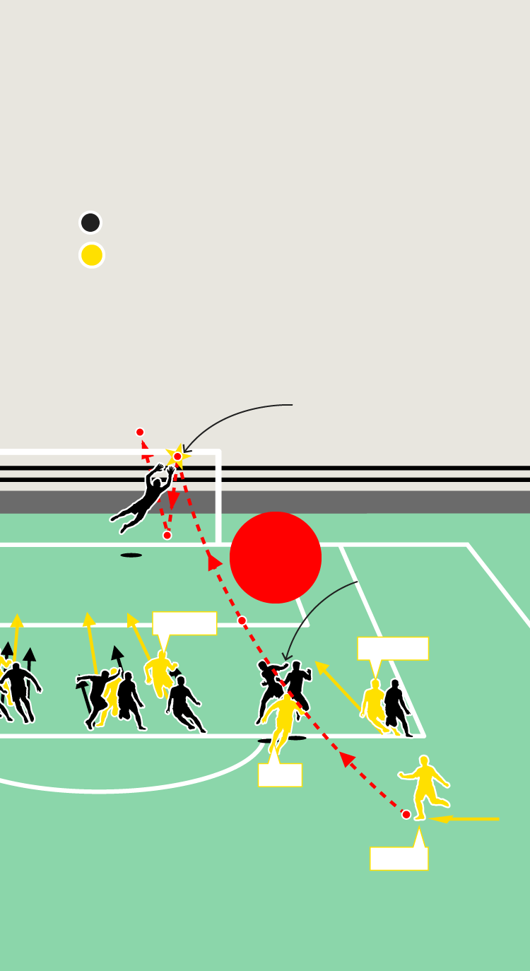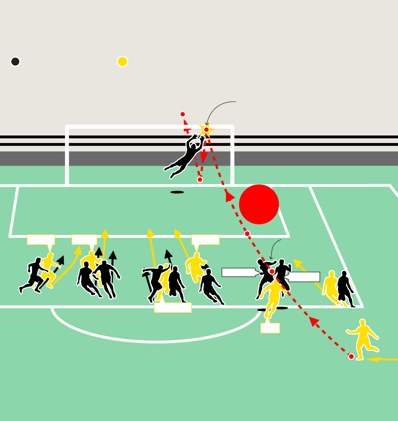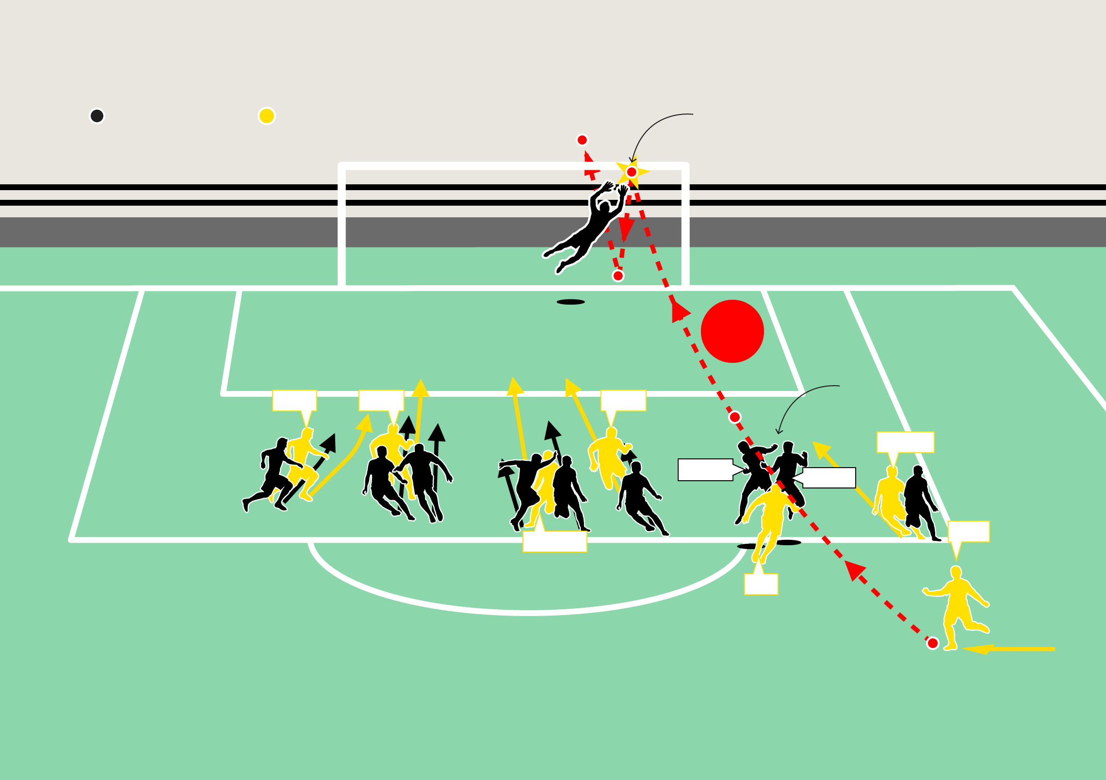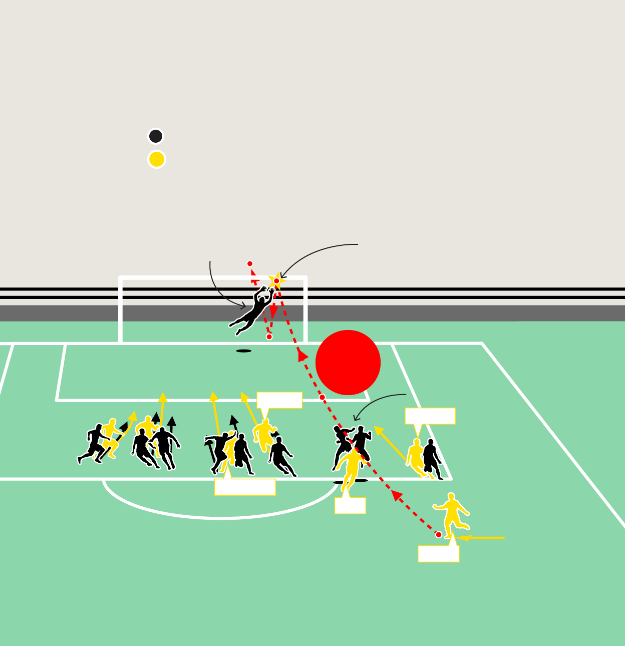La barrera, formada por dos jugadores, salta pero el tiro la supera con facilidad