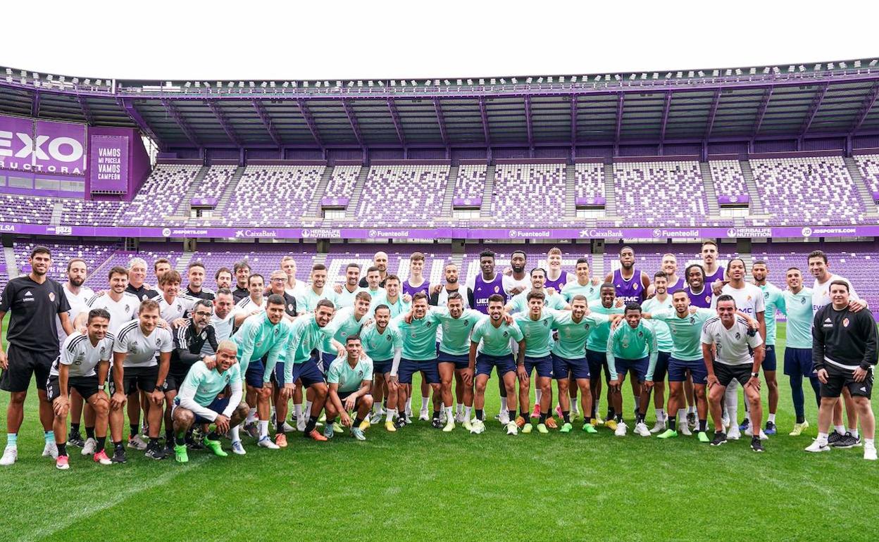 Empieza a ser ya habitual la foto de familia entre las plantillas de fútbol y baloncesto del Real Valladolid, hermanadas bajo el mismo escudo e idénticos colores. Una imagen que hace un año tuvo a Roberto González como protagonista y en la que esta vez ha contado con Paco García como improvisado maestro de ceremonias durante la visita realizada por las instalaciones del estadio.