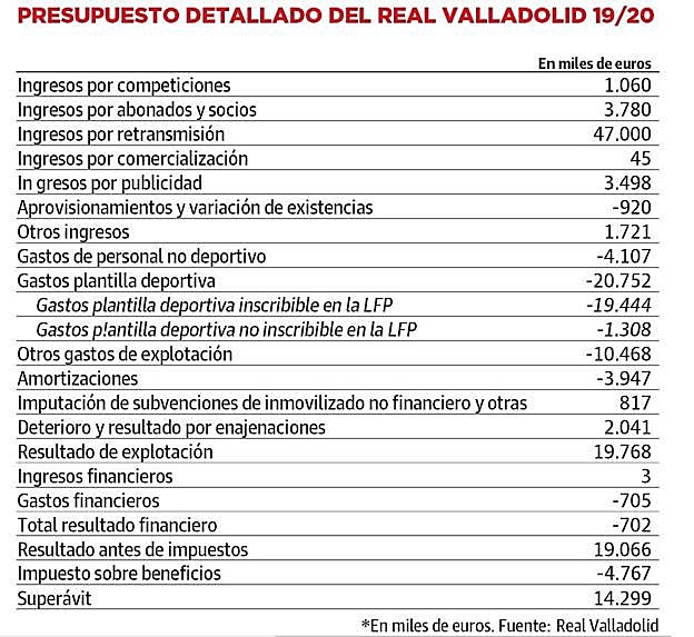 La economía del Real Valladolid va viento en popa. El presupuesto de ingresos y gastos elaborado por la entidad blanquivioleta arroja muy buenos números, con un resultado positivo de 19,06 millones de euros para este curso 2019-2020. Esto indica que el Real Valladolid logra incrementar sus ingresos, pero también que mantiene unos gastos moderados. De hecho, es el club de toda la Primera División que menos desembolsa, con un gasto total de 40,8 millones, por debajo del RCD Mallorca (44,2) y, por supuesto, a años luz de los 988,1 millones del FC Barcelona o los 920 del Real Madrid. A pesar de este condicionante, el Real Valladolid presenta el quinto mejor superávit presupuestado de toda la competición, con 19,06 millones de euros antes de impuestos... que se quedarán en 14,2 millones una vez aplicados los tributos correspondientes sobre los beneficios.
