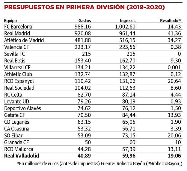 Roberto Bayón, especialista en las finanzas del fútbol español, ha elaborado una tabla comparativa con los presupuestos de la temporada 2019-2020 en Primera División. Ahí se comprueba cómo el Real Valladolid presupuesta el quinto mejor superávit de toda la competición, con los 19,06 millones de euros que refleja en su memoria económica. En lo que respecta a los beneficios presupuestados, solo presentan mejores números el Real Madrid (41,46 millones), Atlético de Madrid (34,27), Espanyol (20,64) y Eibar (20,06), resultados todos antes de impuestos. Pero la entidad blanquivioleta es la tercera con menos ingresos y la primera con menos gastos, por lo que resalta aún más la gestión económica del Real Valladolid de Ronaldo Nazário.