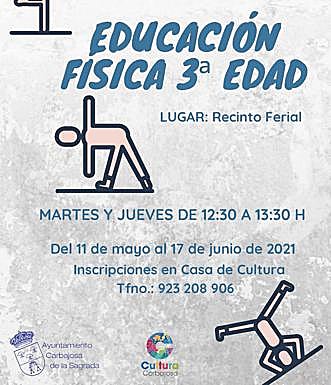 Después de un año de actividades limitadas, especialmente para este sector de la población (uno de los más vulnerables de la pandemia), el Ayuntamiento de Carbajosa ha decidido retomar esta actividad que persigue ayudar a estos vecinos a mantener su vida diaria de la forma más activa posible. El ejercicio físico es vital para evitar el empeoramiento del sistema muscular y cardiorrespiratorio; para mejorar considerablemente la salud ósea y funcional; para combatir enfermedades como la hipertensión o la diabetes; y para luchar contra el sentimiento de soledad de los mayores. La gimnasia para mayores se celebrará al aire libre desde mañana y hasta el día 17 de junio todos los martes y jueves, de 12,30 a 13,30 horas. Las clases se impartirán en el recinto ferial del municipio.