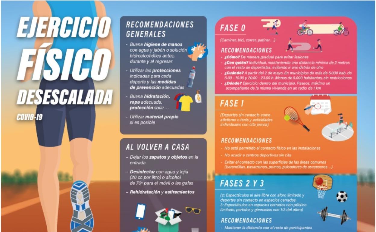 Entre las medidas más demandadas por la sociedad durante todo el encierro estaba la posibilidad de salir a hacer deporte en los espacios públicos. Ahora, este deseo es realidad desde el 2 de mayo y se irá flexibilizando en cada una de las fases. La infografía y el vídeo animado recoge las recomendaciones sanitarias que hay que seguir a la hora de retomar el deporte en estos días. Los salmantinos quieren y necesitan salir a hacer algo de ejercicio físico, pero es importante hacerlo con todas las precauciones posibles para evitar un repunte en los contagios.