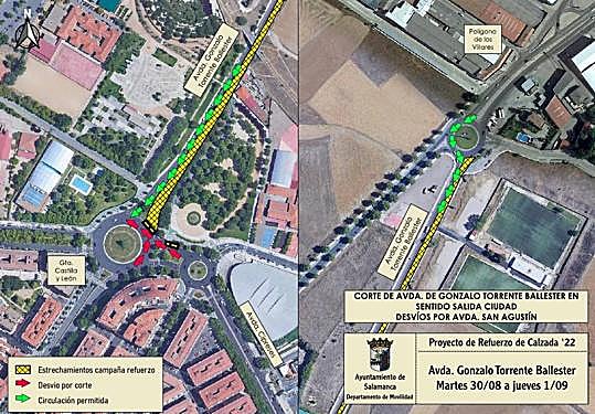 Los trabajos de renovación del firme que el Ayuntamiento de Salamanca está llevando a cabo en diferentes calles de la ciudad motivan una serie de cortes de tráfico y desvíos desde el próximo martes, 30 de agosto, hasta el jueves 1 de septiembre en la Avenida de Gonzalo Torrente Ballester.