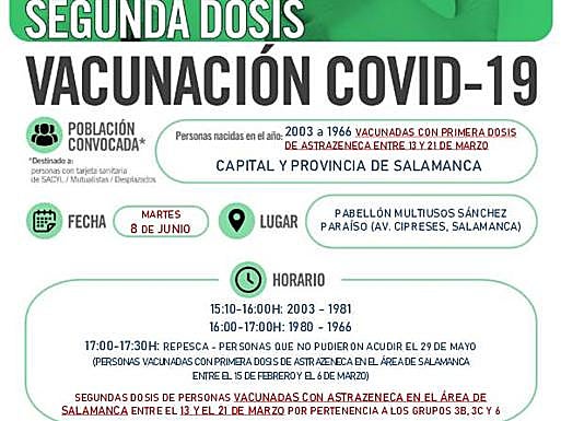 La Junta ha comunicado hoy que el próximo sábado, 5 de marzo se pondrá la segunda dosis de la vacuna de AstraZeneca a los vacunados entre el 7 y el 12 de marzo, por pertenecer a los grupos 3B, 3C y 6 (sanitarios, policías, bomberos, estudiantes que hacen prácticas sanitarias, personal docente....), tanto de la capital como de la provincia. Las inoculaciones de la vacuna comenzarán en el Multiusos Sánchez Paraíso a las 10:00 horas para los nacidos a partir de 1966 y hasta 2003. Las vacunaciones finaliarán a las 19:40 con el personal de mayor edad.