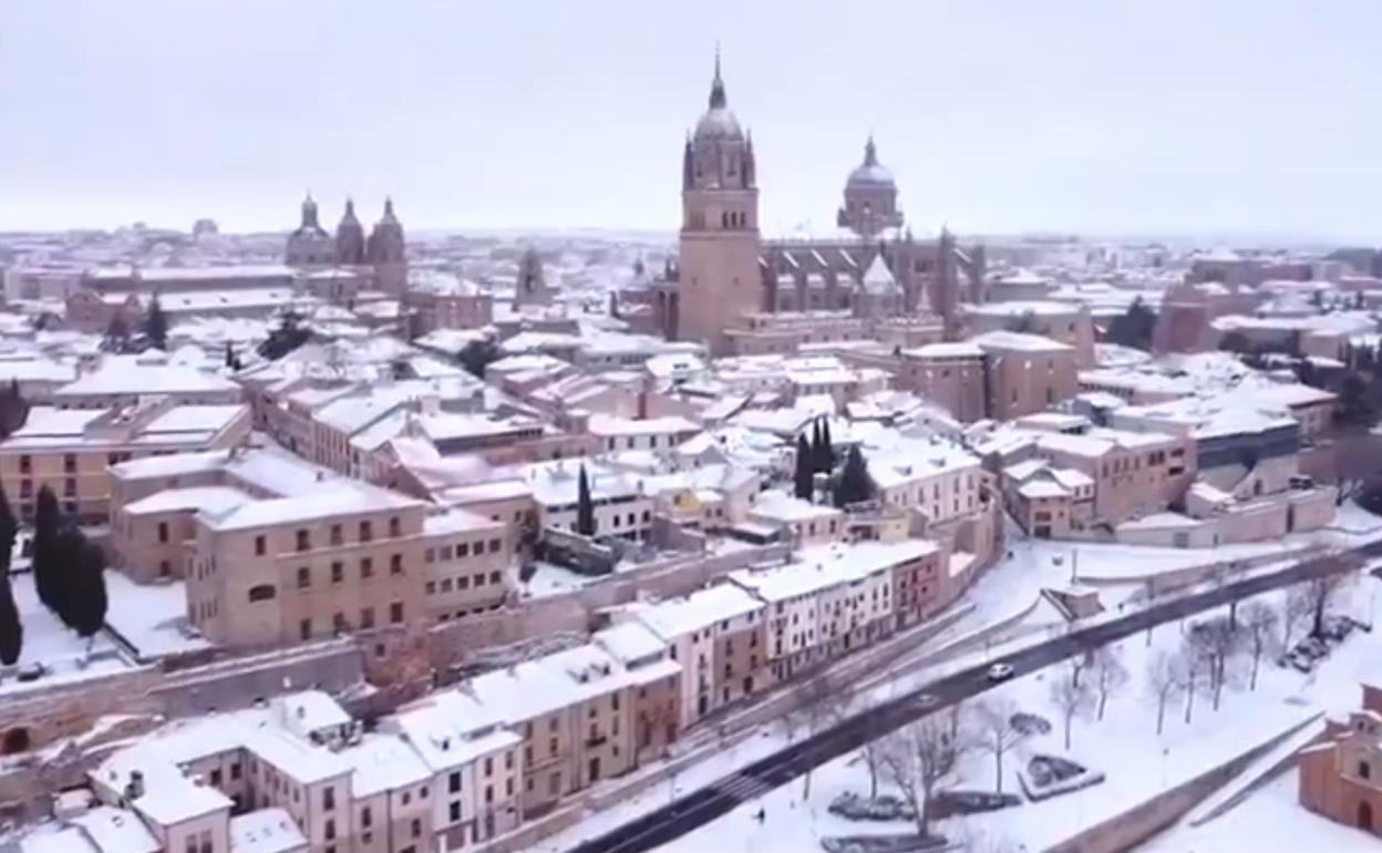 Las precipitaciones han realzado la monumentalidad y 'Turismo de Salamanca' ha aprovechado para emitir un video con las imágenes de la ciudad teñida de blanco, a vista de pájaro.