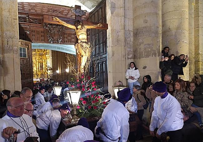 Cientos de riosecanos y visitantes presenciaron este martes en Medina de Rioseco la procesión del bello Cristo de la Clemencia. En su salida, a las ... diez de la noche, desde la iglesia de Santiago, una vez más la altura de la cruz provocó que los doce cofrades de la hermandad tuvieran que esforzarse para que el paso pudiera pasar bajo el dintel de la puerta de la iglesia, en medio de los aplausos de todos los presentes.