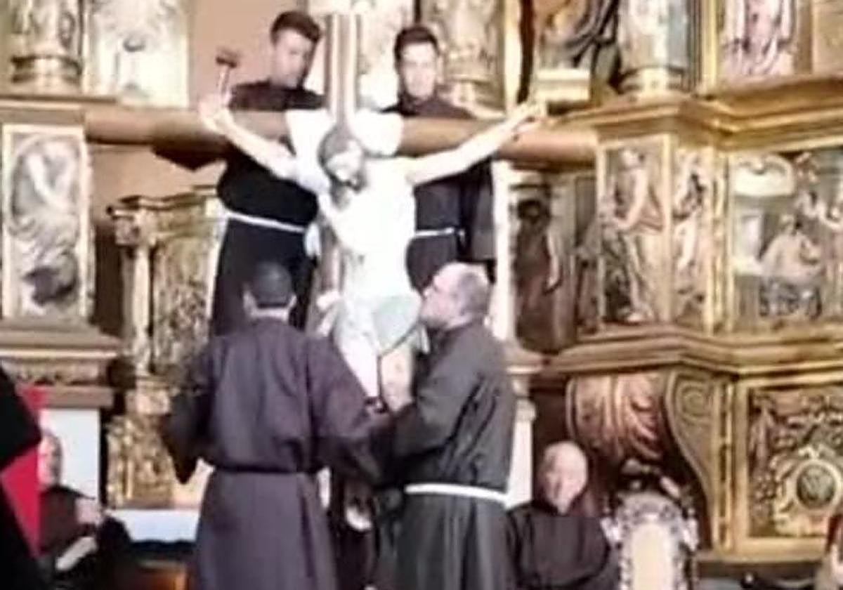 Los anclajes de los brazos ya habían sido separados de los clavos para proceder a este rito del desenclavo, que data de 1758 y que esta localidad vive con fervor como una de las ceremonias más singulares de su Semana Santa. El elevado peso de la talla hizo que se inclinara hacia adelante. Y la pericia de los cofrades evitó que se fuera al suelo y que, incluso, hubiese podido haber algún tipo de desgracia personal.