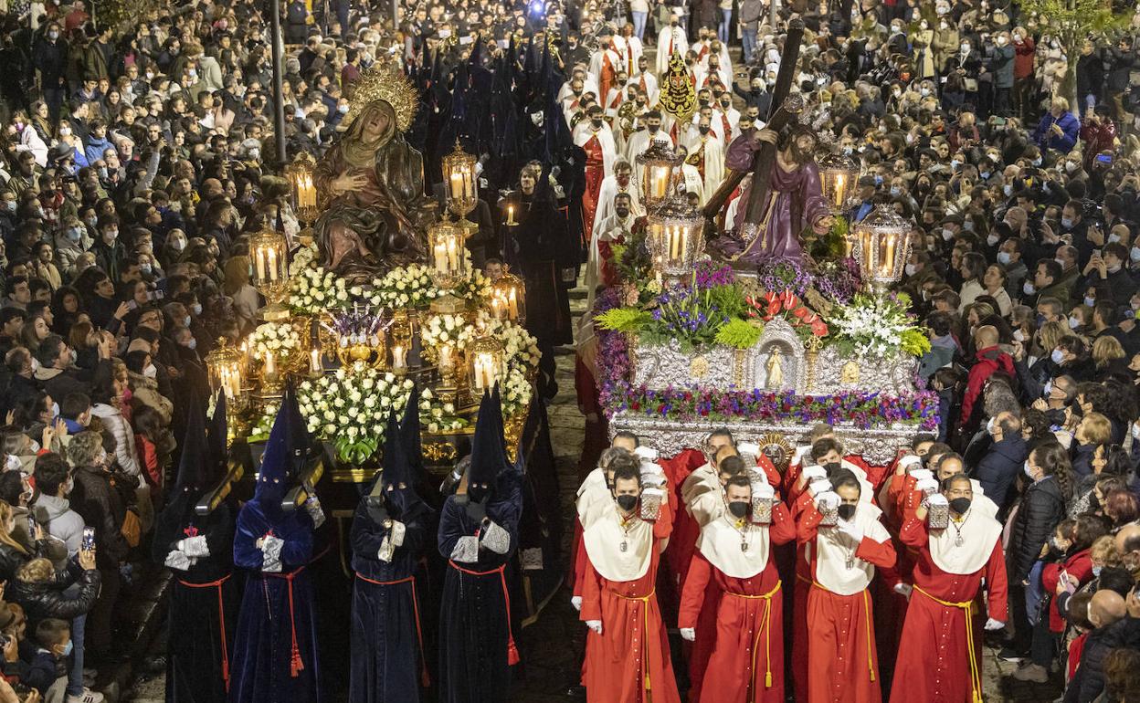 Se evidenciaba en los rostros que el dolor del encuentro de Cristo con su Madre sostiene y alivia incluso el encuentro de muchos ciudadanos tras dos difíciles años de pandemia en los que faltan muchos cofrades, donde no están muchos familiares y seres queridos… Unas circunstancias que quedaron evidenciadas en las caras de las hermanas de devoción, en los ojos de los penitentes bajo el capuchón, pero sobremanera en las medallas que iban entrelazadas en los siete cuchillos que se disponen a los pies de la Virgen de las Angustias y que pertenecen a hermanos cofrades fallecidos desde la última Semana Santa. Este detalle, discreto entre el adorno floral pero reconocible, se hacía llamativo porque las medallas destacaban entre los cuchillos, unos elementos metálicos que simbolizan los siete dolores de la Virgen.