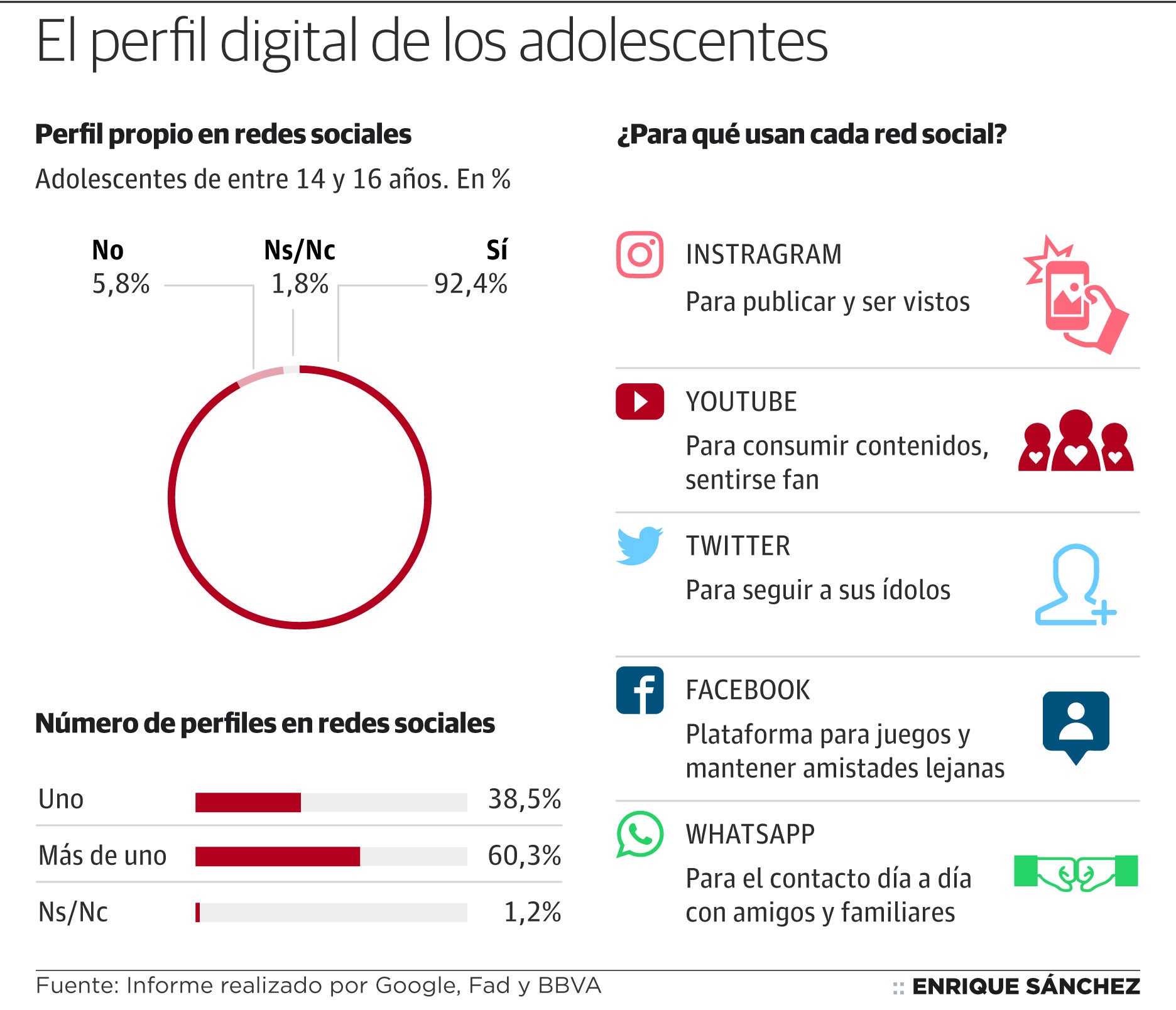 Entre las redes sociales, la que más utilizan los jóvenes es Instagram, pero donde más se consumen los contenidos es en YouTube. «Crean y comparten sus propios contenidos», dice Alemany. «Usan las redes para sentirse integrados, con una relación ambivalente: conscientes de las ventajas y de sus límites». Por ejemplo, los adolescentes consideran que las personas en las redes mienten (83%), que se puede llegar a establecer afectos intensos (58,8%), que los códigos de relación son diferentes que en el cara a cara (57%) y que la imagen en redes tiene poco que ver con la realidad, el 'postureo' (48,7%). «Las usan para autopresentarse, que los demás vean lo que publico, ése es el objetivo. Además quiero ver cómo me ven.