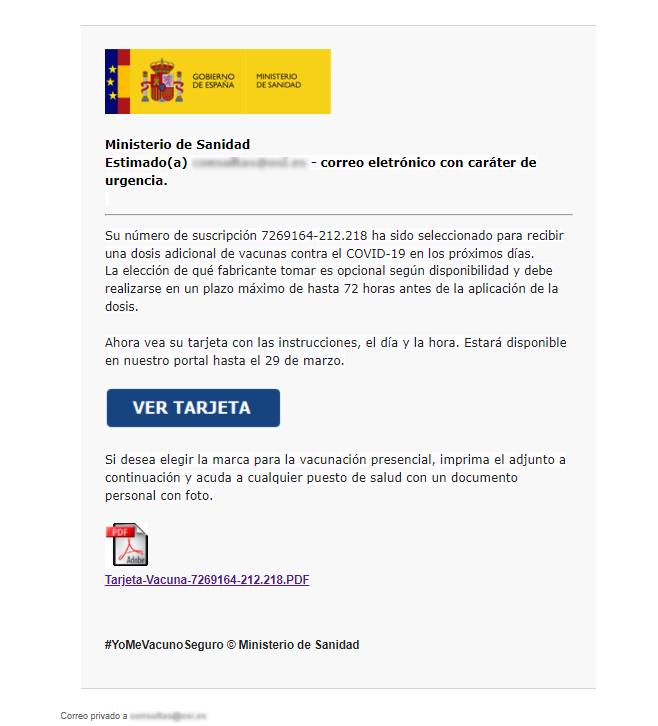 - El correo electrónico se envía desde una dirección que no pertenece al dominio oficial correspondiente al Ministerio de Sanidad y con el asunto '!Tenemos un anuncio urgente sobre la dosis extra de vacuna!', aunque no se descarta que puedan estar enviándose otros correos con otros asuntos parecidos o incluso diferentes.