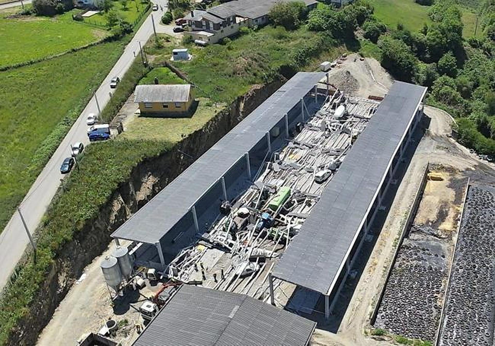 Bomberos de Asturias, el helicóptero del SEPA y Guardia Civil trabajan a marchas forzadas revisando los escombros de la nave ganadera cuya techumbre colapsó, por causas que se desconocen. El suceso se produce menos de dos meses después de que cinco mineros perdieran la vida en el interior de una mina en Cerredo.