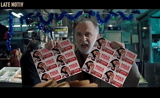La versión de 'Late Motiv' gira en torno a un denominador común: la cantante catalana. Los niños de San Ildefonso desaparecen para ceder su protagonismo a la autora de 'Pienso en tu mirá' o 'Malamente'. Es el tono de alerta del despertador de Juan, aparece en la televisión y en el boleto que el protagonista del spot sostiene: está obsesionado con comprar entradas para un concierto de la artista. Para cerrar el anuncio de la Lotería, el programa de Buenafuente sustituyó el rótulo '22 de diciembre. Sorteo extraordinario de Navidad' por 'Rosalía en Navidad siempre toca'.