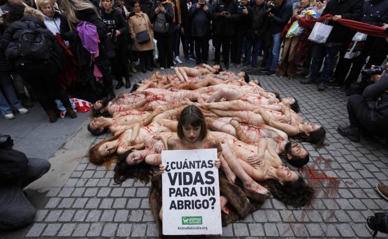 Medio centenar de activistas de la organización AnimaNaturalis se han desnudado este domingo en la céntrica calle Preciados para exigir el cierre de las granjas peleteras, ha informado la organización en un comunicado.