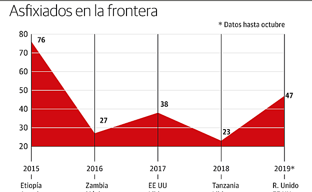 En grupos, algunas veces, se suben a los contenedores. «En Algeciras», ratificó un conductor gallego que encontró a once hombres mezclados con su carga en Francia, con rumbo a Reino Unido, uno de los destinos con más muertos por asfixia en 'trailers': 42 en cinco años han sido registrados por la Organización Internacional de Migraciones (OIM), incluyendo el más reciente de los migrantes vietnamitas de Essex. Un destino sólo superado en la fatalidad por los 71 fallecidos asfixiados en Viena en agosto de 2015.