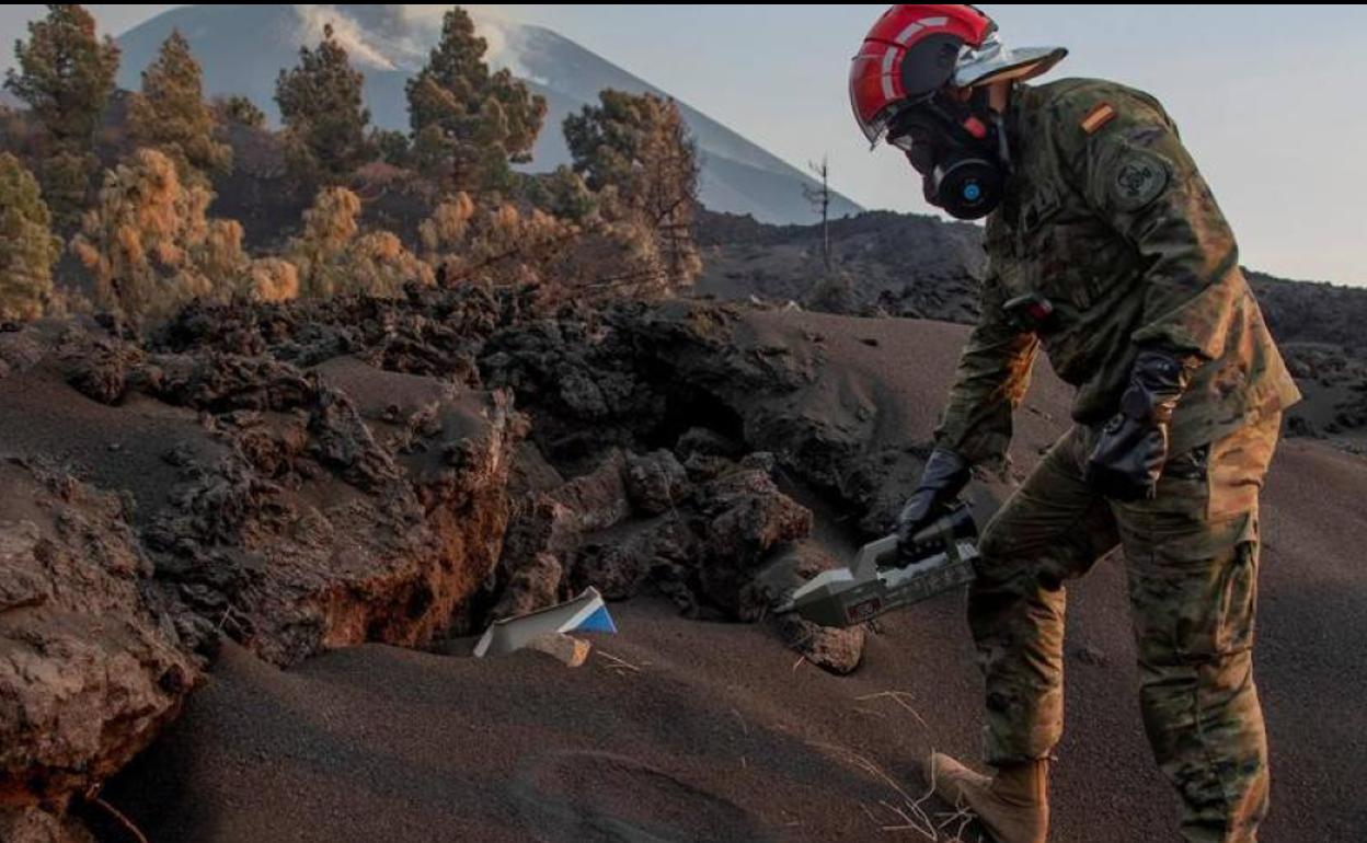 Militares monitorizando la emisión de gases del volcán en la zona de exclusión. Efe
