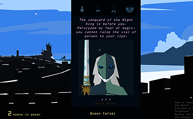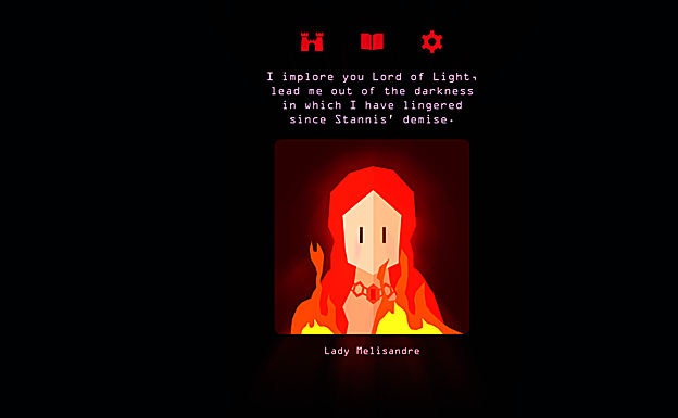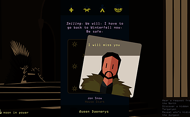 En el título, los usuarios deben tratar de mantenerse en el trono el mayor tiempo posible, y lo hacen tomando decisiones ante las diferentes situaciones que se van generando, lidiando con personajes secundarios, todo con el objetivo de mantener el equilibrio entre los diferentes grupos de poder: la Iglesia, el Pueblo, el Ejército y el Tesoro. Sobra decir que la adaptación al universo de Juego de Tronos le sienta como anillo al dedo, y permite a los usuarios tomar el control de personajes varios como la propia Daenerys, el enano Tyrion, Cersei Lannister, Sansa Stark o Jon Nieve, entre otros; todos ellos observados bajo la atenta mirada de Melisandre, y reimaginar posibles reinados (y muertes) para ellos.