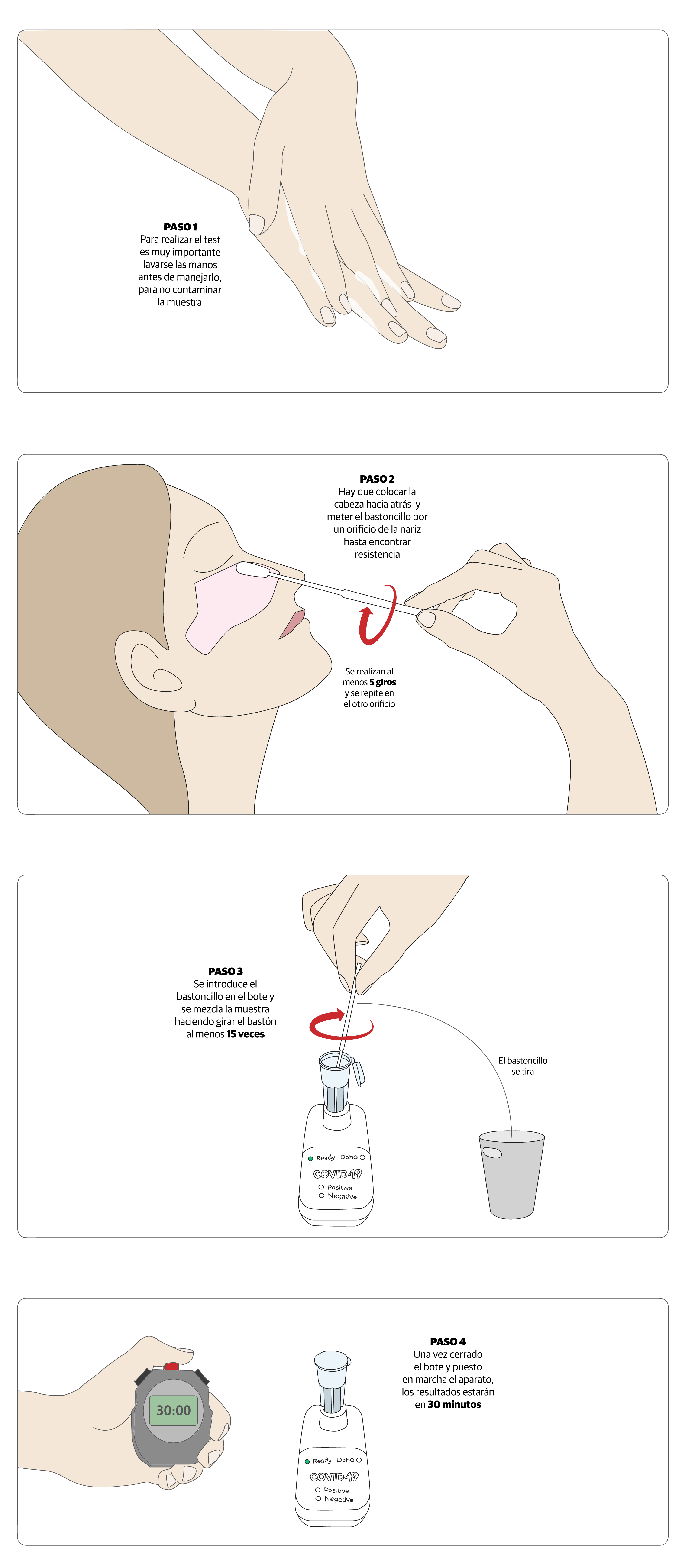 Así pues, es un aparato de pequeñas dimensiones, que puede ser adquirido en farmacia previa prescripción médica y usado en casa por personas mayores de 14 años. Ideado hace cinco años para detectar la gripe, pero habiendo evolucionado en mitad de la pandemia de coronavirus, es de un solo uso y bastan cuatro pasos para saber si la infección por coronavirus es positiva o negativa.