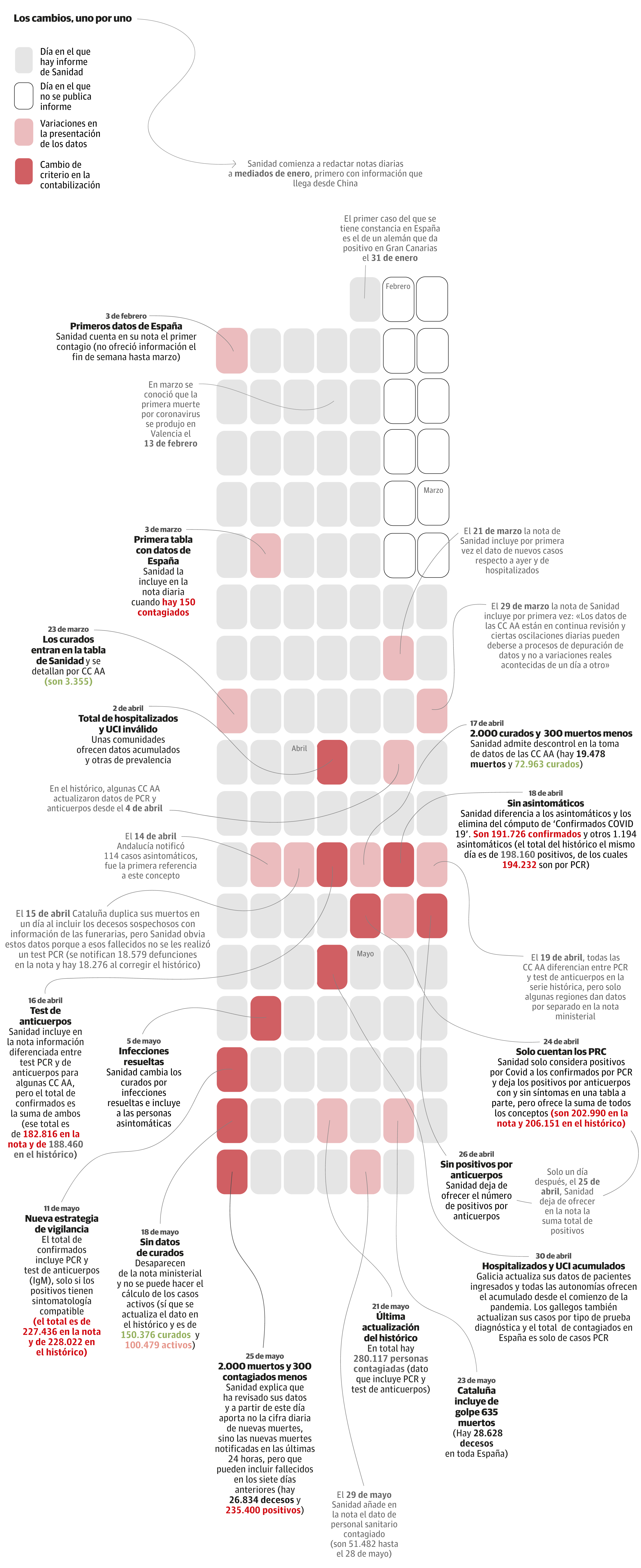 Día tras día durante la pandemia el Ministerio de Sanidad ofrece los datos de cada una de las autonomías en una nota que ha ido variando con el tiempo, tanto en periodicidad como en contenido. Cambios bruscos, como el del 25 de este mes, el último hasta la fecha y que redujo el número de muertos en 2.000 personas, han llamado la atención al grueso de la población española. Esta es una de las alteraciones que los dirigentes y sus asesores han ejecutado en esta información diaria, pero no la única.