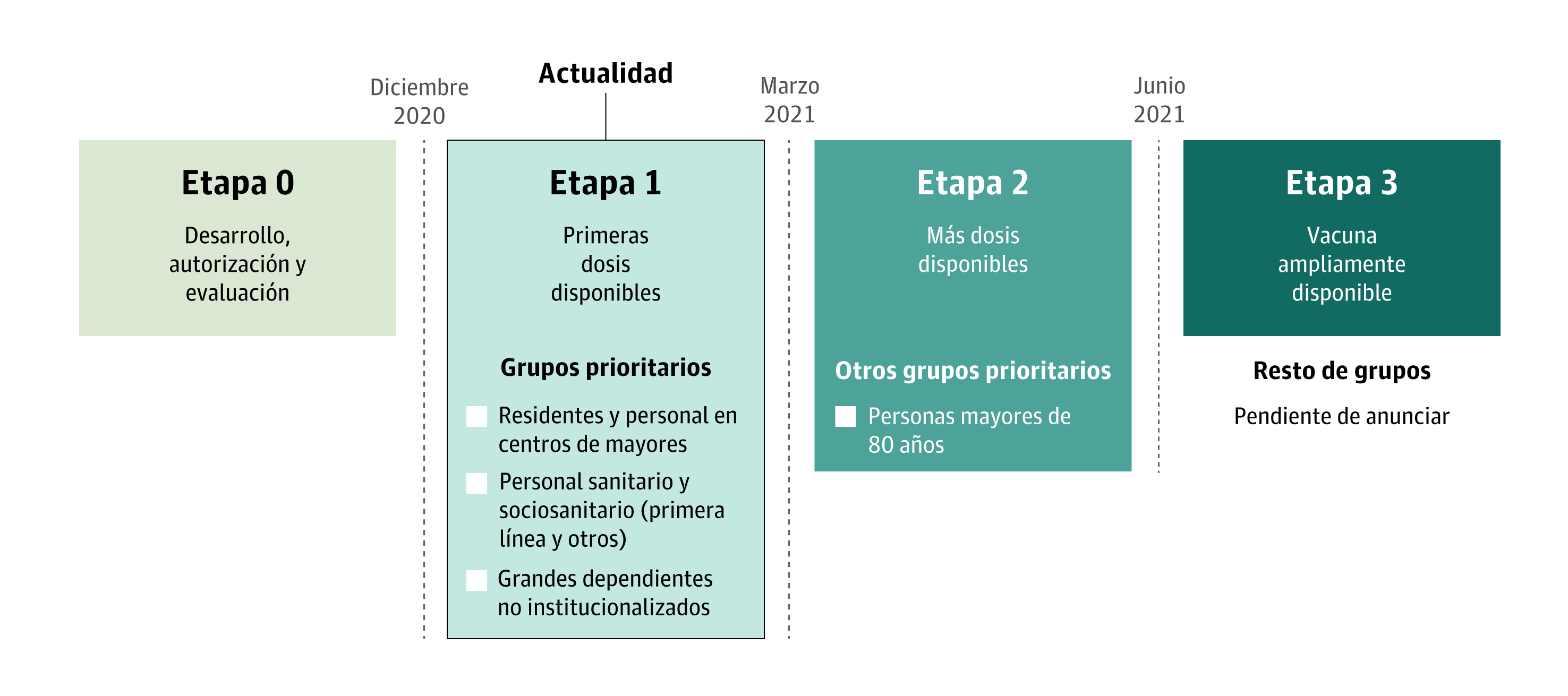 Hasta la fecha, la velocidad de vacunación propuesta por el Gobierno queda muy lejos de la tasa actual. Según los cálculos de Díez y Miszewska serían necesarios cerca de cuatro años para vacunar a toda la población. Este dato, no obstante, cambiará y el objetivo es que lo haga para acercarse a la previsión inicial, que se resume en estas cuatro etapas:
