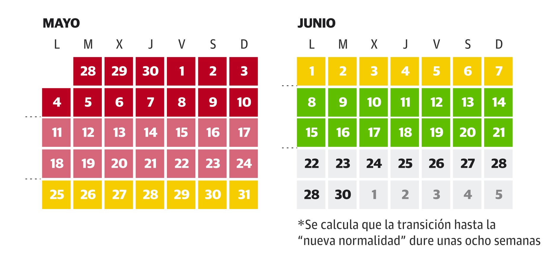 No se han fijado fechas determinadas para cada una de las fases. Entre ellas pasará un mínimo de dos semanas por cuestiones de cuarentena. De este modo, se calcula que la transición a la 'nueva normalidad' durará al menos cerca de ocho semanas. Por otro lado, en función del cumplimiento de los marcadores establecidos, unas zonas podrían entrar en agunas de las fases en días diferentes.