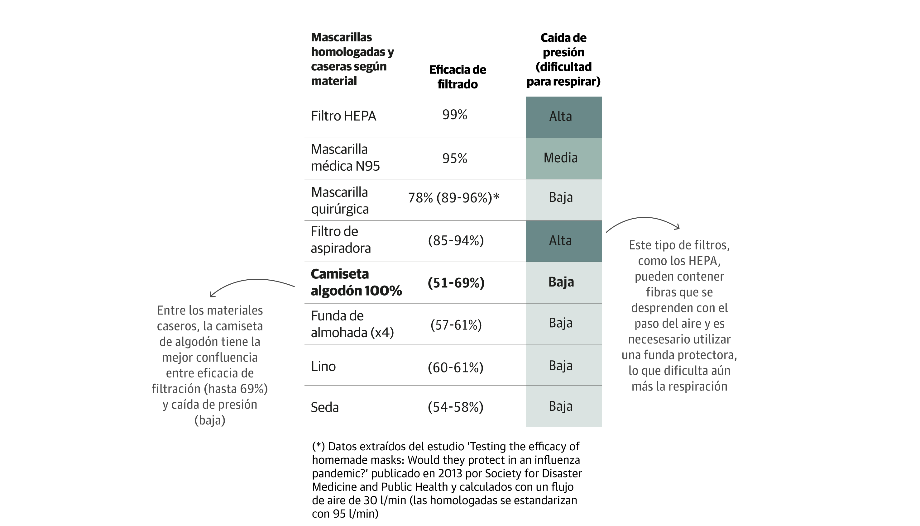 Un estudio publicado por la Society for Disaster Medicine and Public Health en 2013 mide la eficacia de filtrado y la facilidad para respirar de diferentes mascarillas caseras y las compara con una quirúrgica. El objetivo de los investigadores era conocer si las mascarillas caseras pueden proteger en una pandemia de gripe y concluyen que estas tienen un efecto mínimo si no son usadas en conjunción con otras medidas preventivas, como pueden ser el lavado de manos o la distancia social. Además, las etiquetan como la última alternativa posible cuando hay desabastecimiento comercial de mascarillas homolagadas, pero entienden que usarlas es mejor que no llevar nada. Con ello, determinan que una camiseta de algodón 100% es el mejor material casero. Estos son sus resultados: