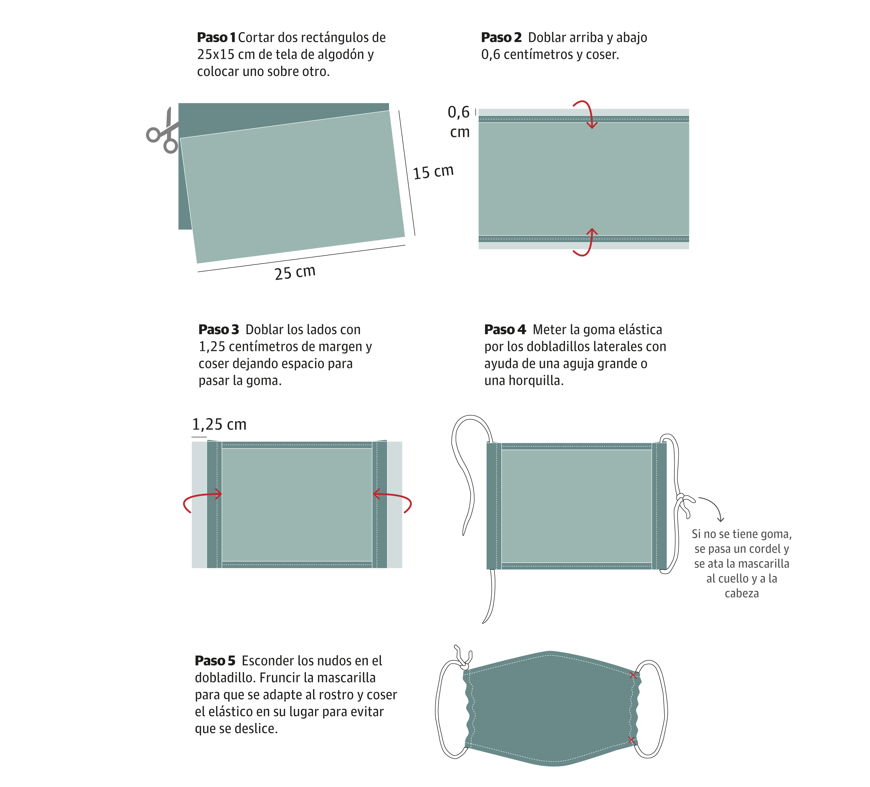 Se necesitan: dos trozos de tela de algodón de 25 por 15 cm; dos cintas elásticas (valen dos gomas de pelo) o cordeles; tijeras, aguja e hilo o máquina de coser.