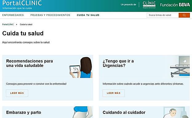 El portal está estructurado en tres grandes bloques: Enfermedades, Pruebas y procedimientos y el apartado Cuida tu salud, en el que se hace especial hincapié en la prevención.