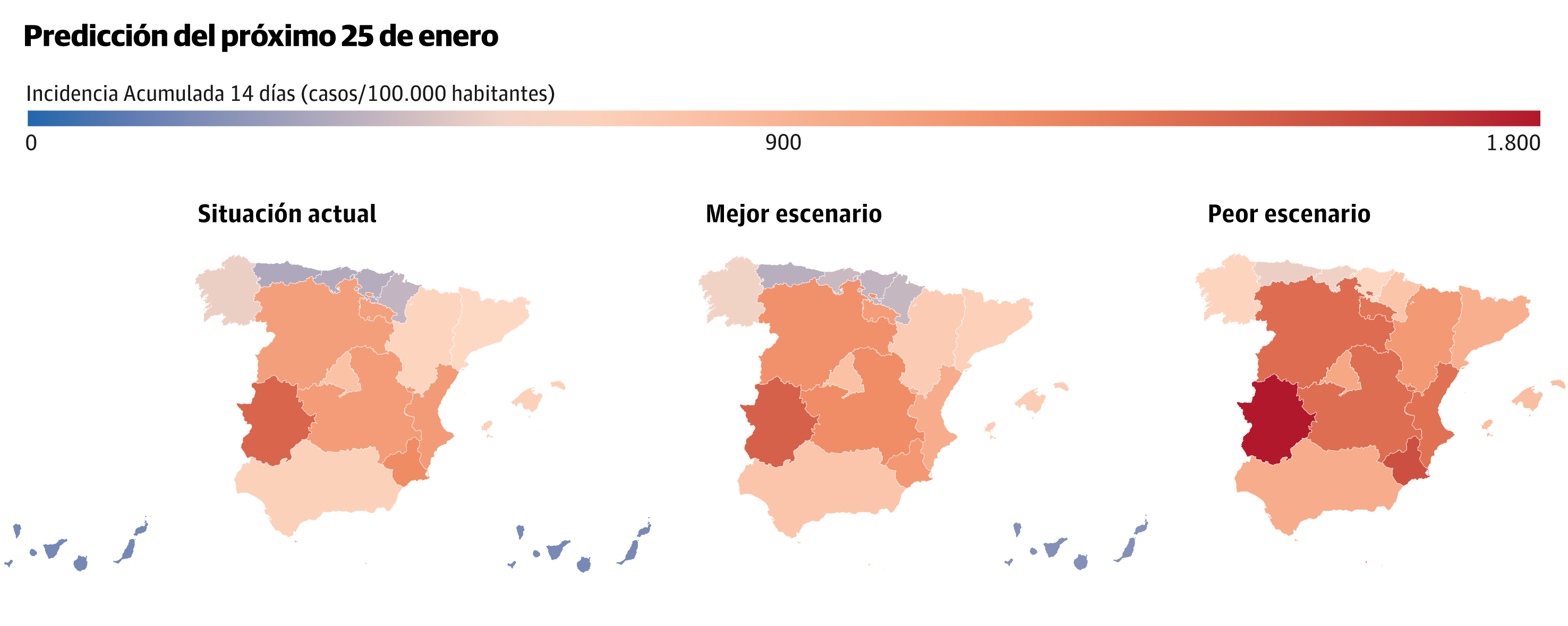 En el peor escenario hay siete comunidades autónomas cuya incidencia acumulada en los últimos 14 días estará por encima de los 1.000 casos de coronavirus por 100.000 habitantes a final de semana. Extremadura, Murcia, Castilla y León, Castilla-La Mancha, Comunidad Valenciana y La Rioja conservarían el millar que ahora alcanzan y se uniría Aragón, además de la ciudad autónoma de Melilla. Es uno de los resultados que se extrae del modelo matemático aplicado por Santi García Cremades, si bien cada uno de los territorios muestra un desarrollo dispar ante el avance de la pandemia.